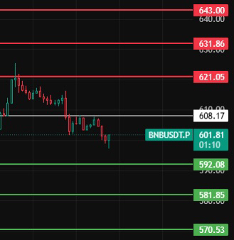 BNB今天留意608这个位置,站不上此位置说明反弹没有力度,继续往下下方支撑位留意592-582-570这几个位置附近!