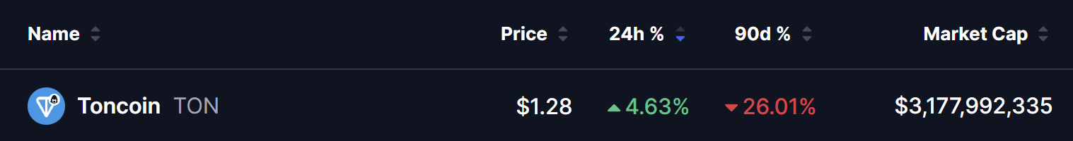 Toncoin (TON) в настоящее время торгуется по цене $1.28, показав заметный рост на +4.63% за последние 24 часа. Однако токен остается под давлением на более длительном временном интервале, упав на 26.01% за последние 90 дней. С рыночной капитализацией примерно $3.18 миллиарда, TON продолжает занимать место среди 30 лучших криптовалют, демонстрируя устойчивость, несмотря на более широкие рыночные проблемы и значительное снижение с его локального максимума в начале июня 2024 года.