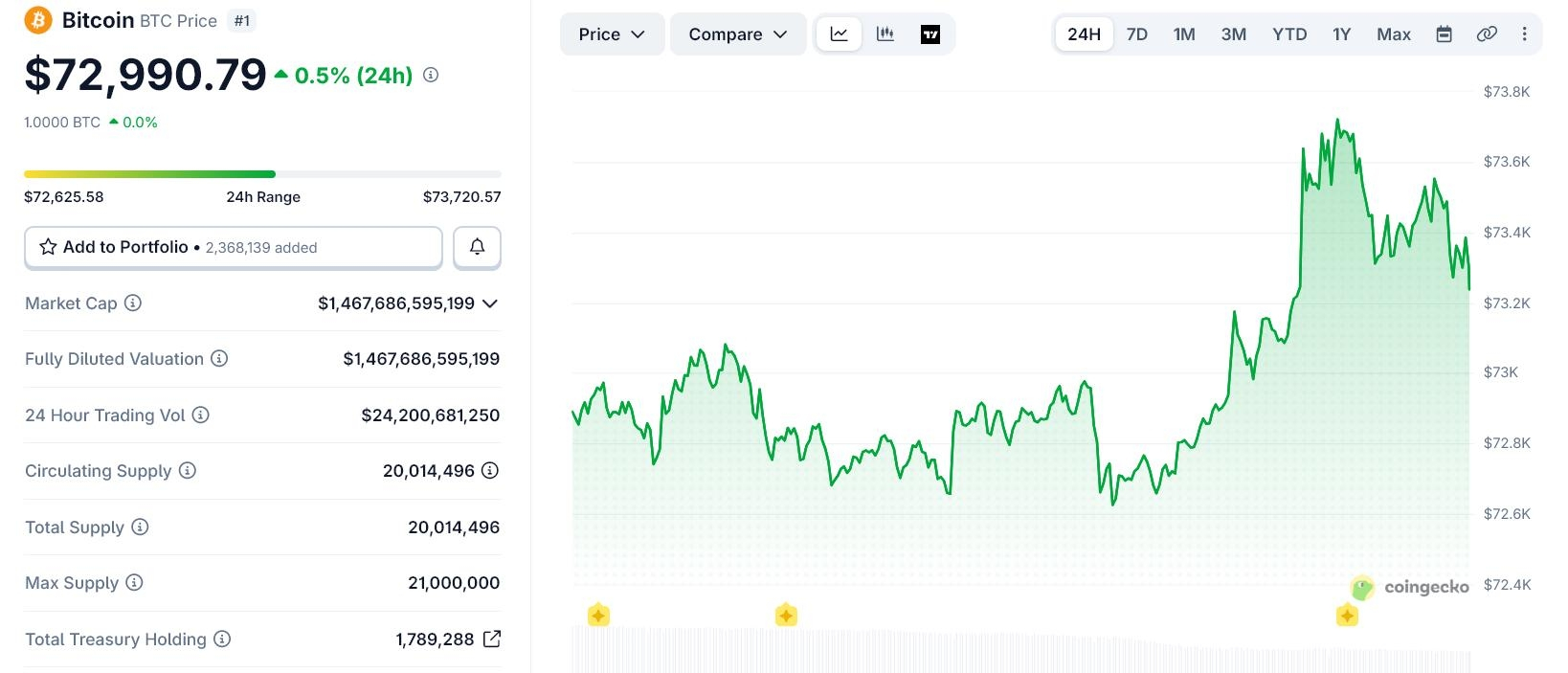 Биткоин поднимался почти до $74 000 в субботу, но затем снизился — рынки отреагировали на новости о переговорах между США и Ираном, которые проходят в Исламабаде.