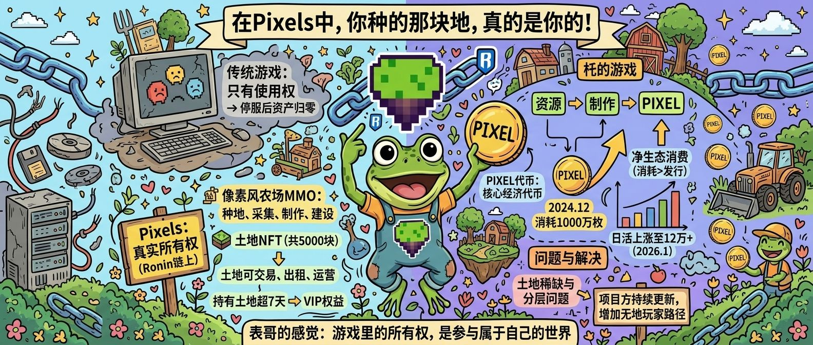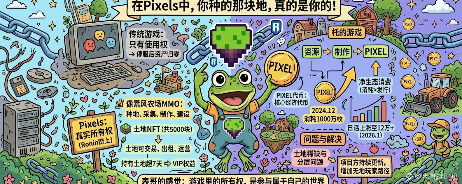 Pixels是一款跑在Ronin链上的像素风农场MMO,玩法说起来不复杂,种地、采集、制作道具、建农场,但它跟你以前玩过的游戏有一个根本上的不同,就是你在里面拥有的东西是真实的资产,不是存在某家公司服务器上、哪天说删就删的数据。游戏里的土地是NFT,总共只有5000块,每一块的所有权都记在链上,买了之后可以在Ronin Market上交易,可以出租给别的玩家,可以自己运营,更关键的是,就算哪天游戏真的停了,你的地还在链上,没有任何一家公司能单方面把它从你手里拿走,这跟传统游戏里那个使用权完全不同。