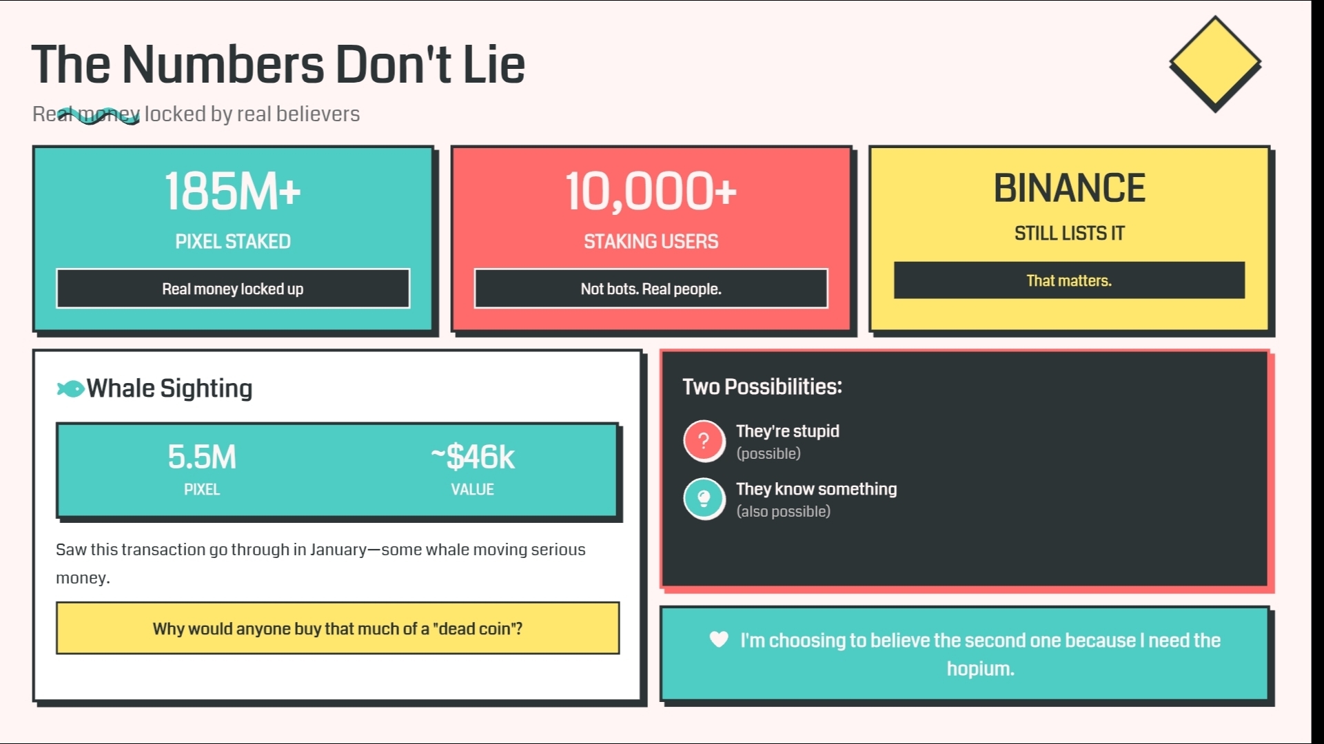 Они также делают эту вещь с vPIXEL и Limit Break. Токен, который можно тратить, обеспеченный 1:1 против PIXEL. Идея заключается в том, чтобы остановить людей от немедленного сброса вознаграждений. Создать активы, которые имеют полезность, вместо того чтобы быть чистой спекуляцией. Я не знаю, сработает ли это, но это отличается от обычной схемы "напечатай токен, выложи на биржу, смотри, как он умирает". Binance все еще его листит. Это имеет значение для меня. Пара PIXEL/USDT имеет объем даже сейчас. Я видел транзакцию на 5,5 миллиона PIXEL в январе — какой-то кит перемещал 46 тысяч. Почему кто-то купит так много мертвой монеты? Либо они глупы (возможно), либо они знают что-то (тоже возможно). Я выбираю верить во второе, потому что мне нужно немного надежды.