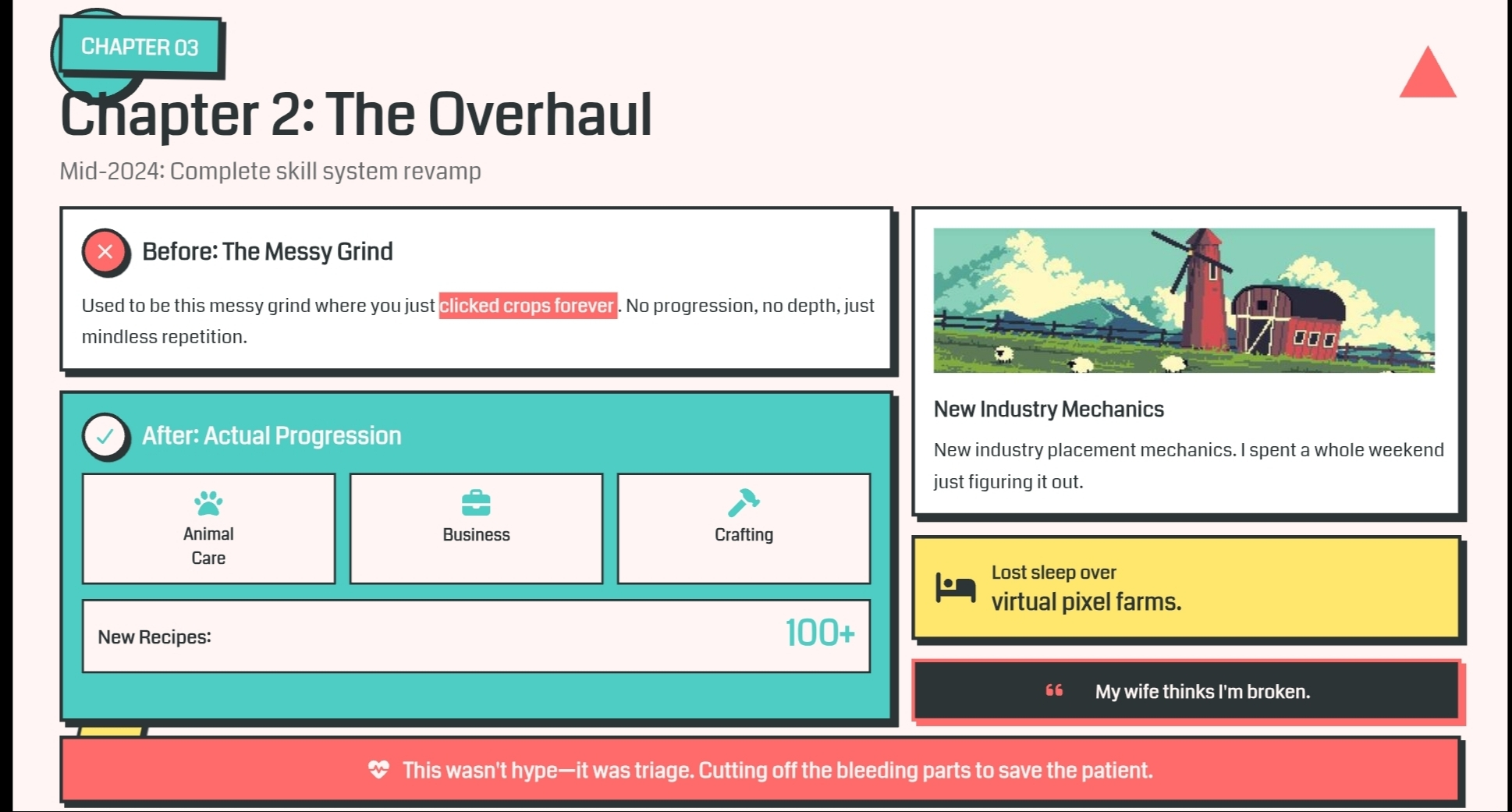 Глава 2 вышла в середине 2024 года, и они полностью переработали систему навыков. Раньше это была беспорядочная механика, где ты просто кликал по культурам бесконечно. Теперь есть реальный прогресс — Уход за животными, Бизнес, Уровни Крафта с примерно 100 новыми рецептами. Я провел целые выходные, разбираясь в новой механике размещения в индустрии. Не спал из-за виртуальных пиксельных ферм. Моя жена думает, что я сломлен. Но самый главный шаг? Убийство BERRY. Они обменяли сумки всех на PIXEL по фиксированному курсу и ввели эту внецепную валюту "Монеты". Это разозлило многих фермеров дохода, которые получали 2% ежедневной прибыли. Хорошо. Эти парни все равно были паразитами. Ничего личного, если ты был одним из них, но ты был.