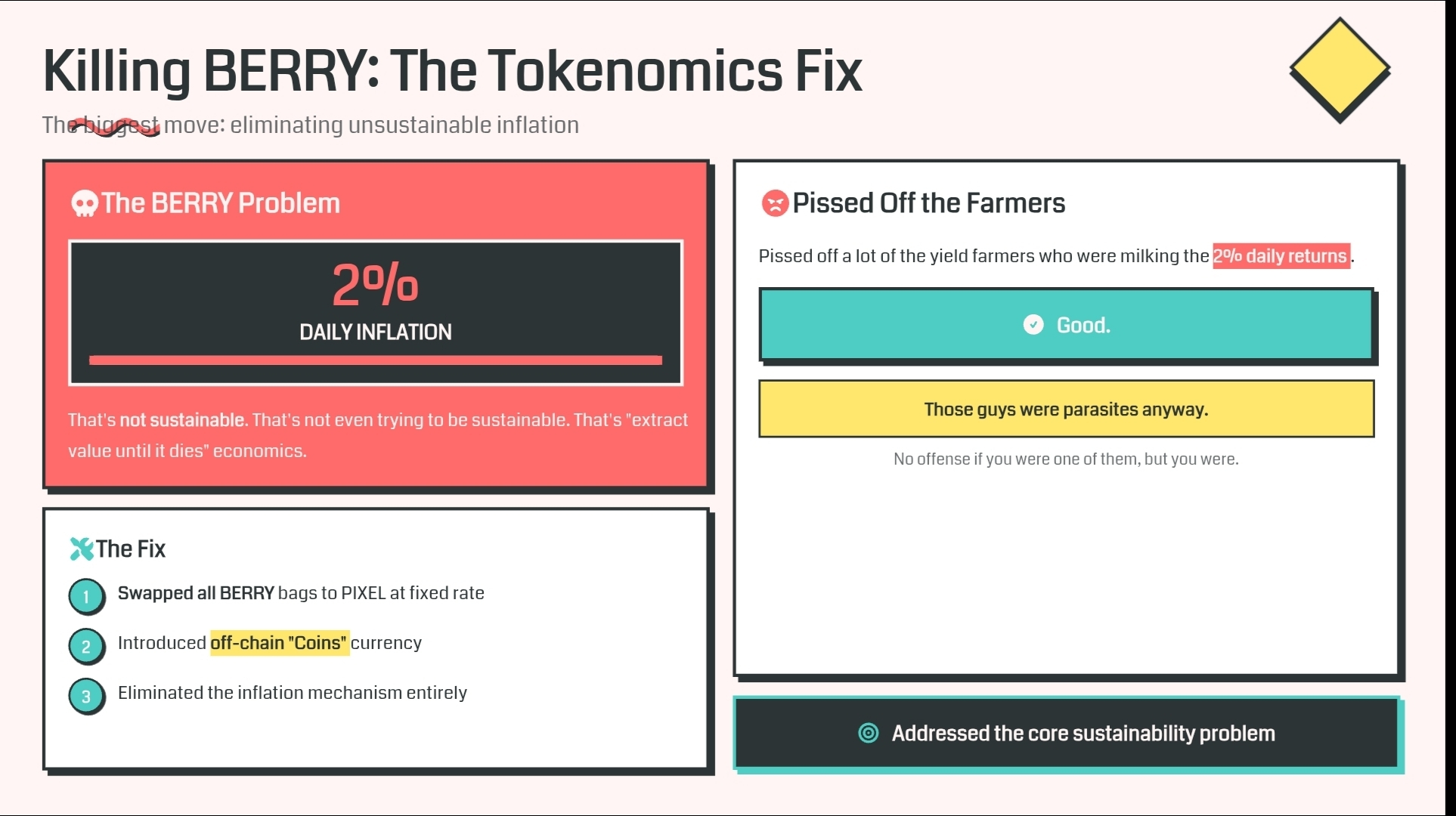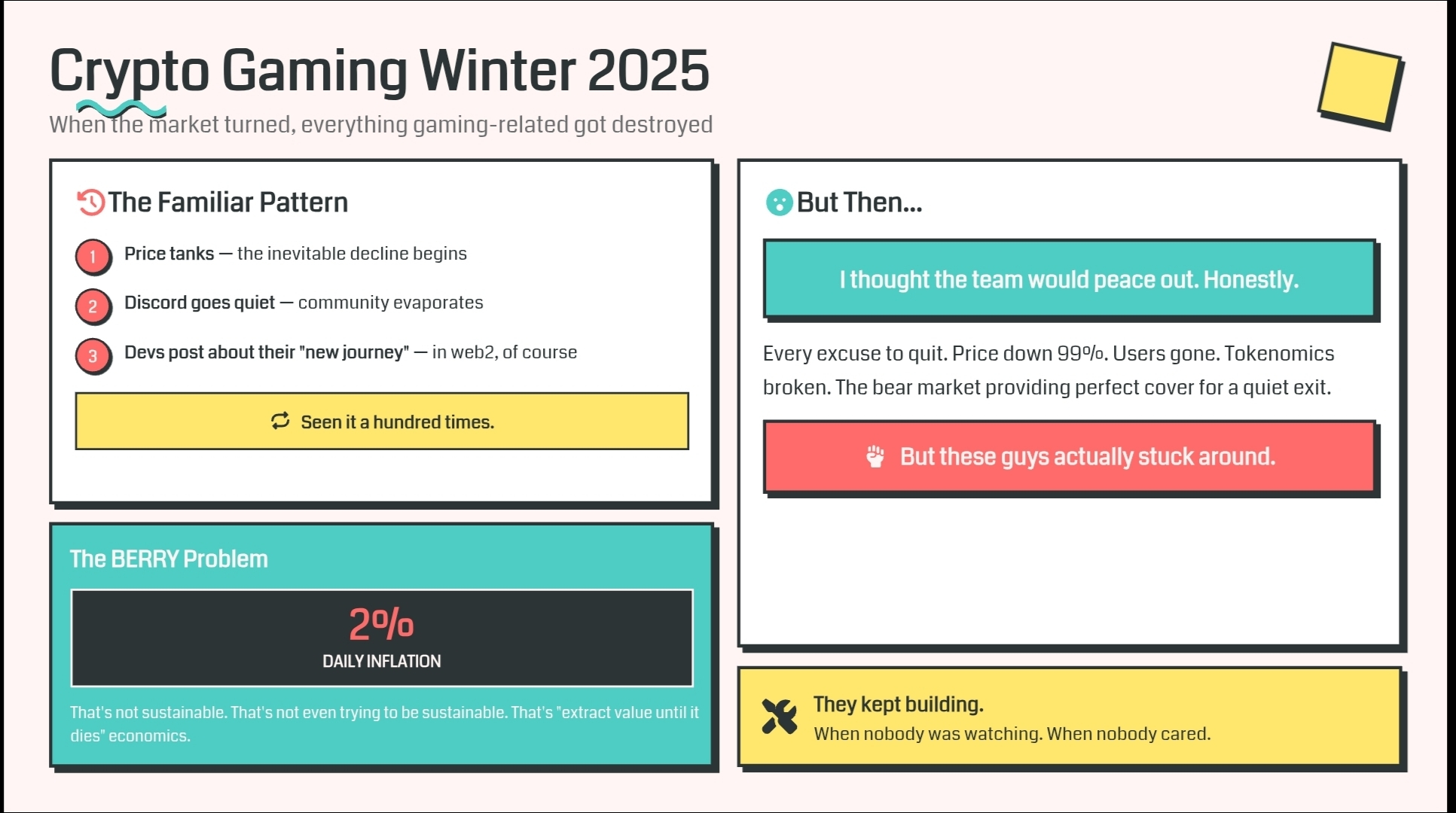 Потом случился 2025 год. Крипто зима часть два, электрический бугало. Все, что связано с играми, было уничтожено. Не только PIXEL — все это. GALA, SAND, MANA, выбери свой яд. Но PIXEL пришлось особенно тяжело, потому что у них был этот целый инфляционный токен под названием BERRY, который по сути печатал деньги в небытие. Два процента ежедневной инфляции. Это не устойчиво. Это даже не пытается быть устойчивым. Это "извлекай ценность, пока не умрет" экономика. Я думал, что команда уйдет. Честно. Видел это сотни раз. Цена падает, Discord замолкает, разработчики начинают постить о своем "новом пути" в web2. Но эти ребята действительно остались.