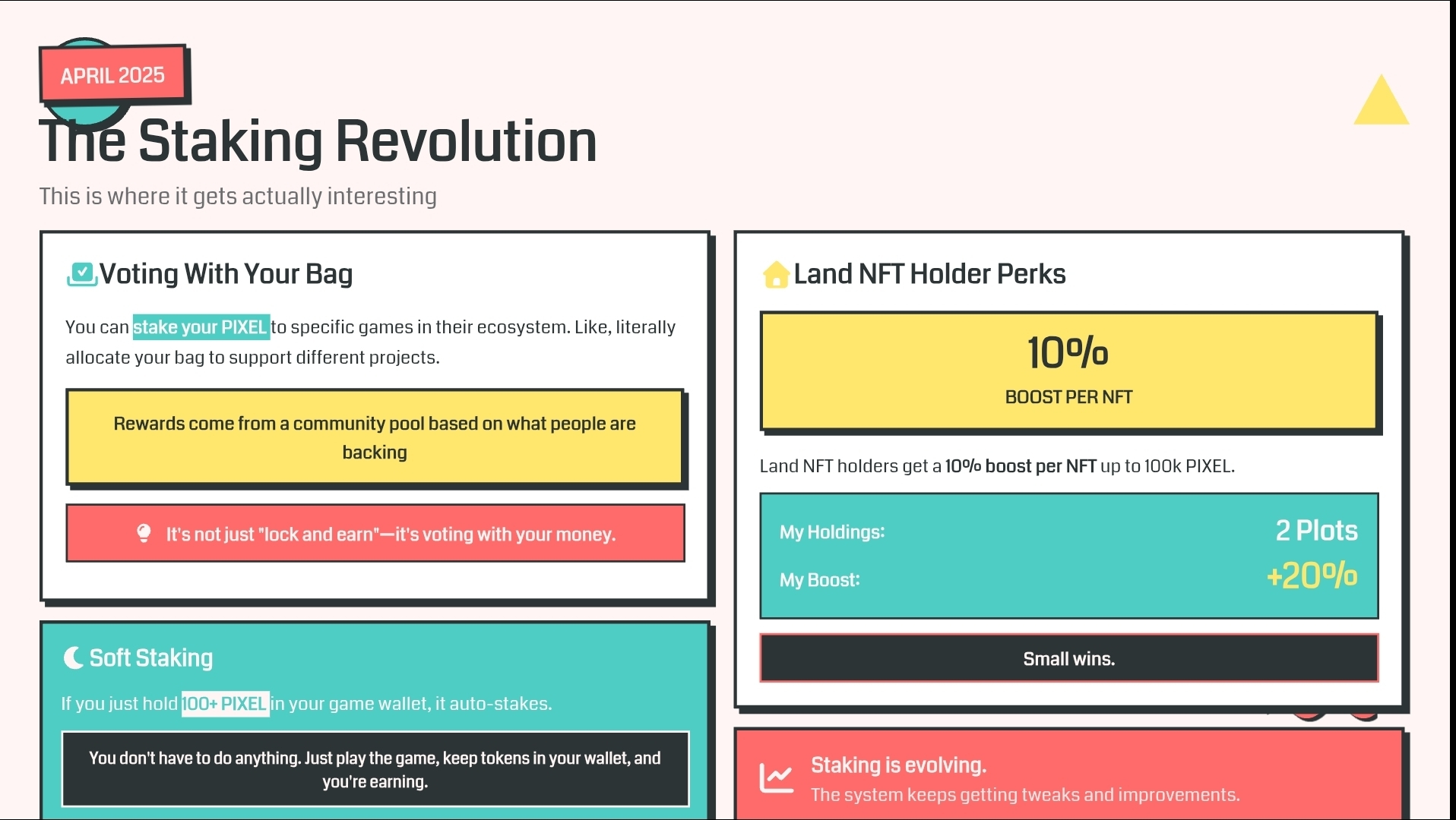 Потом они добавили систему стекинга в апреле 2025 года. Вот где это становится действительно интересным. Ты можешь ставить свой PIXEL на конкретные игры в их экосистеме. Как бы, буквально распределять свою сумку, чтобы поддерживать разные проекты. Вознаграждения приходят из общего пула на основе того, что поддерживают люди. Это не просто "заблокируй и зарабатывай" — это голосование твоими деньгами. И если ты просто держишь 100+ PIXEL в своем игровом кошельке, это автоматически ставится. Мягкий стекинг, как они его называют. Тебе не нужно ничего делать. Просто играй в игру, держи токены в своем кошельке, и ты зарабатываешь. Держатели NFT земли получают 10% бонуса за каждый NFT до 100 тысяч PIXEL. У меня два участка, так что это 20% дополнительно. Маленькие победы.