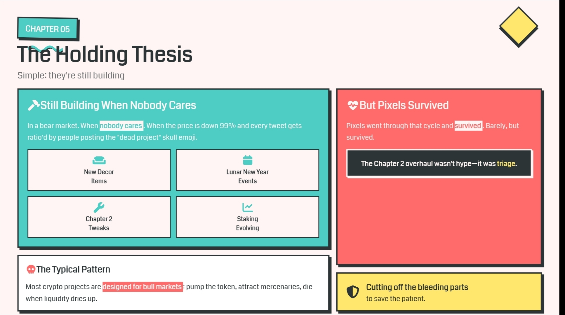 Большинство криптопроектов разрабатываются для бычьих рынков. Накачай токен, привлеки наемников, умри, когда ликвидность иссякнет. Pixels прошел через этот цикл и выжил. Едва, но выжил. Переработка главы 2 не была хайпом — это была экстренная помощь. Остановка кровотечения, чтобы спасти пациента.