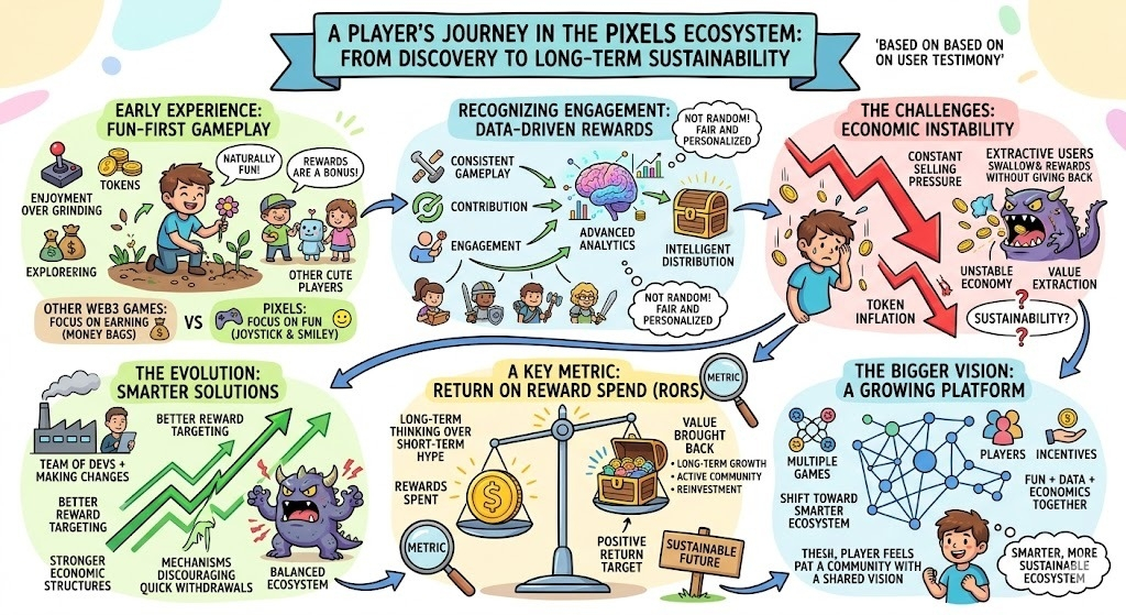 Когда я углубился в игру, я начал замечать, как умно распределяются награды. Это не было случайным. Казалось, что игра действительно распознает значимые действия, будь то последовательный игровой процесс, вклад или вовлеченность. Позже я понял, что Pixels использует системы, основанные на данных, и продвинутую аналитику для целенаправленного распределения наград. Это сделало мой опыт более персонализированным и справедливым по сравнению с другими играми, где награды часто достаются краткосрочным игрокам.