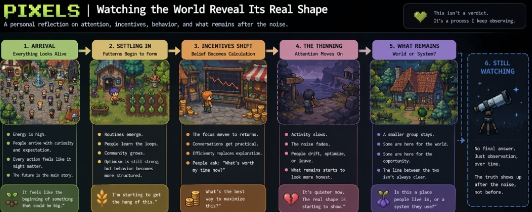 What interests me isn’t whether Pixels succeeds in the way people usually measure success. It’s whether it holds its shape once attention shifts elsewhere. Because attention always shifts. It doesn’t disappear—it just relocates. And when it does, whatever remains starts to look more honest.