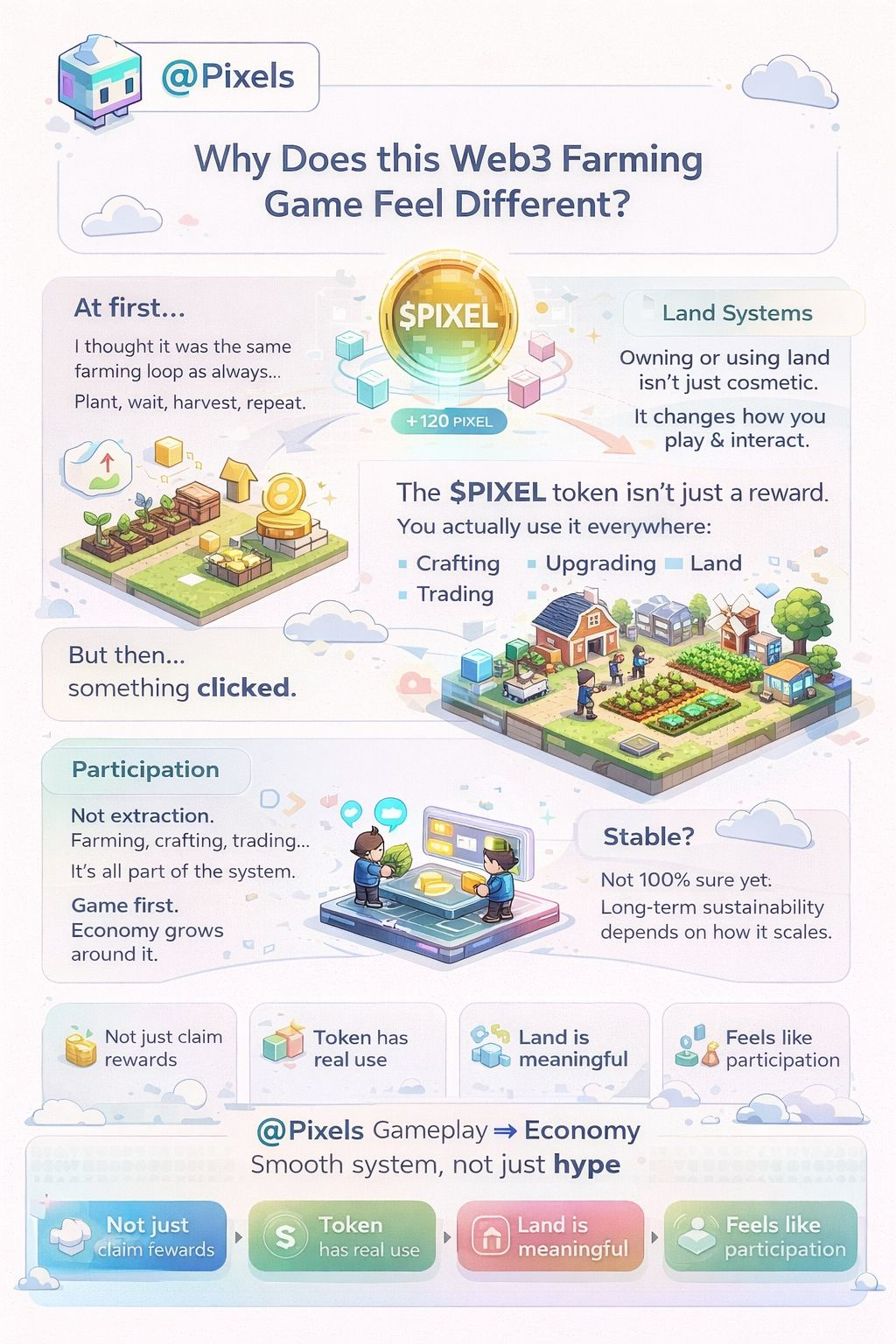 Я играл в эту игру о фермерстве. Что-то кажется... другим в хорошем смысле. Я думал об этом некоторое время. Должен признаться, когда я впервые услышал о @Pixels , я подумал, что это еще одна фермерская игра. Вы знаете такой тип... сажать урожай, ждать, собирать, повторять. Я видел это много раз в Web2, и даже в Web3 это не совсем новое.