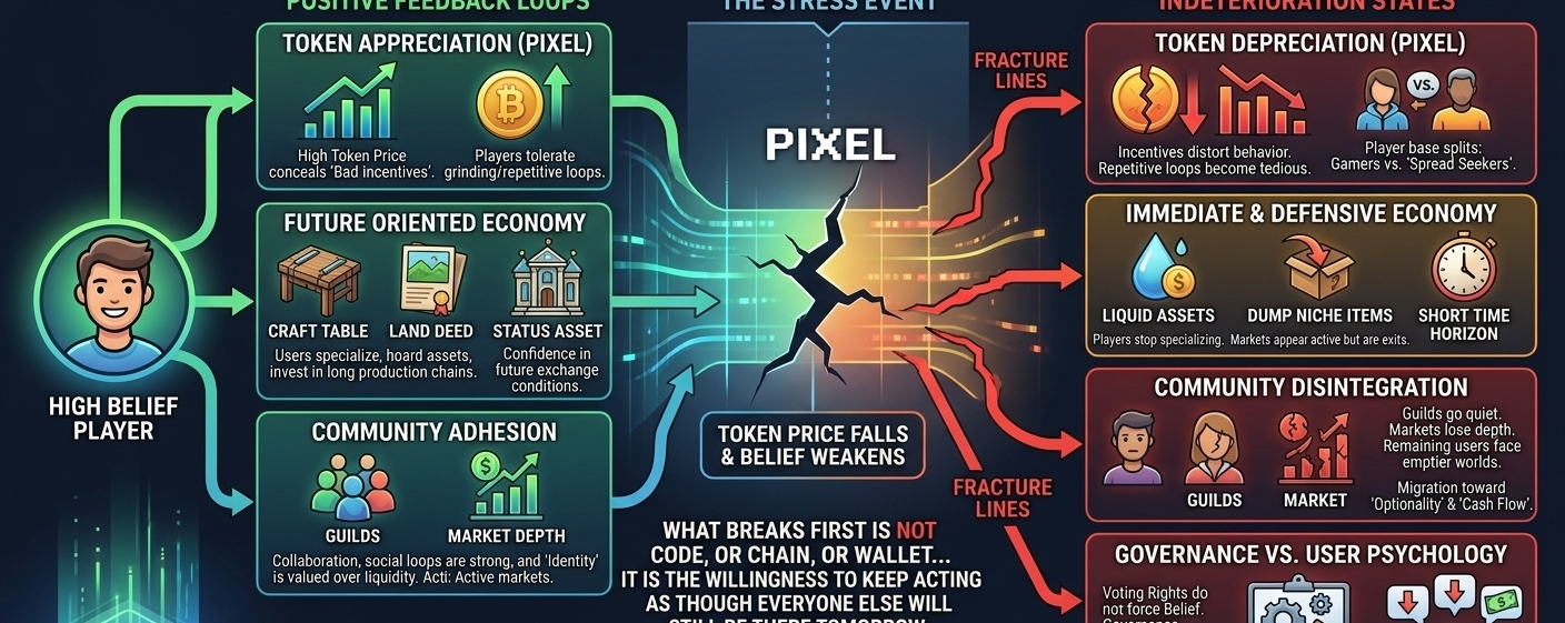I do not say this to dismiss PIXEL specifically. I say it because systems that merge play, markets, and ownership face a harsher version of the same law. When belief weakens, people simplify their motives. They choose liquidity over identity, cash flow over loyalty, optionality over immersion. What breaks first is rarely the chain, the wallet, or the code. It is the willingness to keep acting as though everyone else will still be there tomorrow.