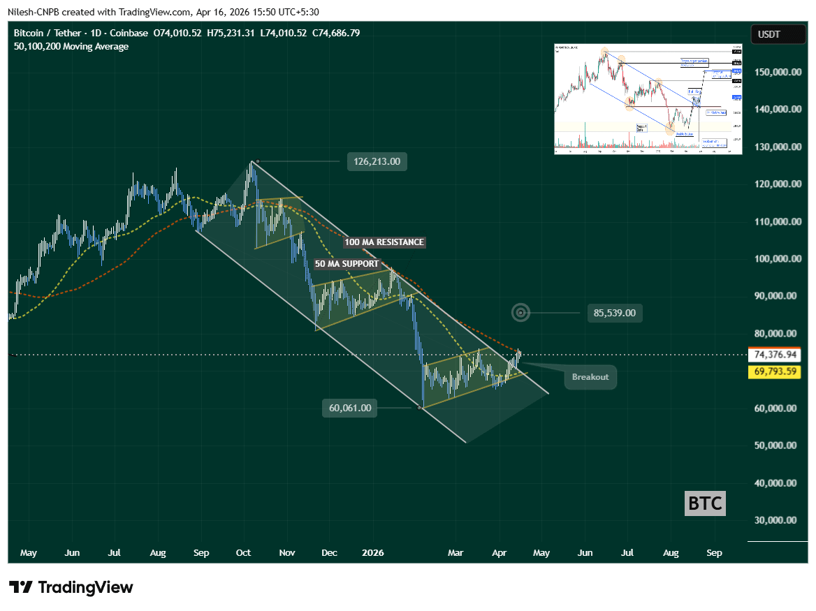 Technical Breakout: BTC broke out of descending channel; now testing $74,843 resistance. Next target: $85,000.