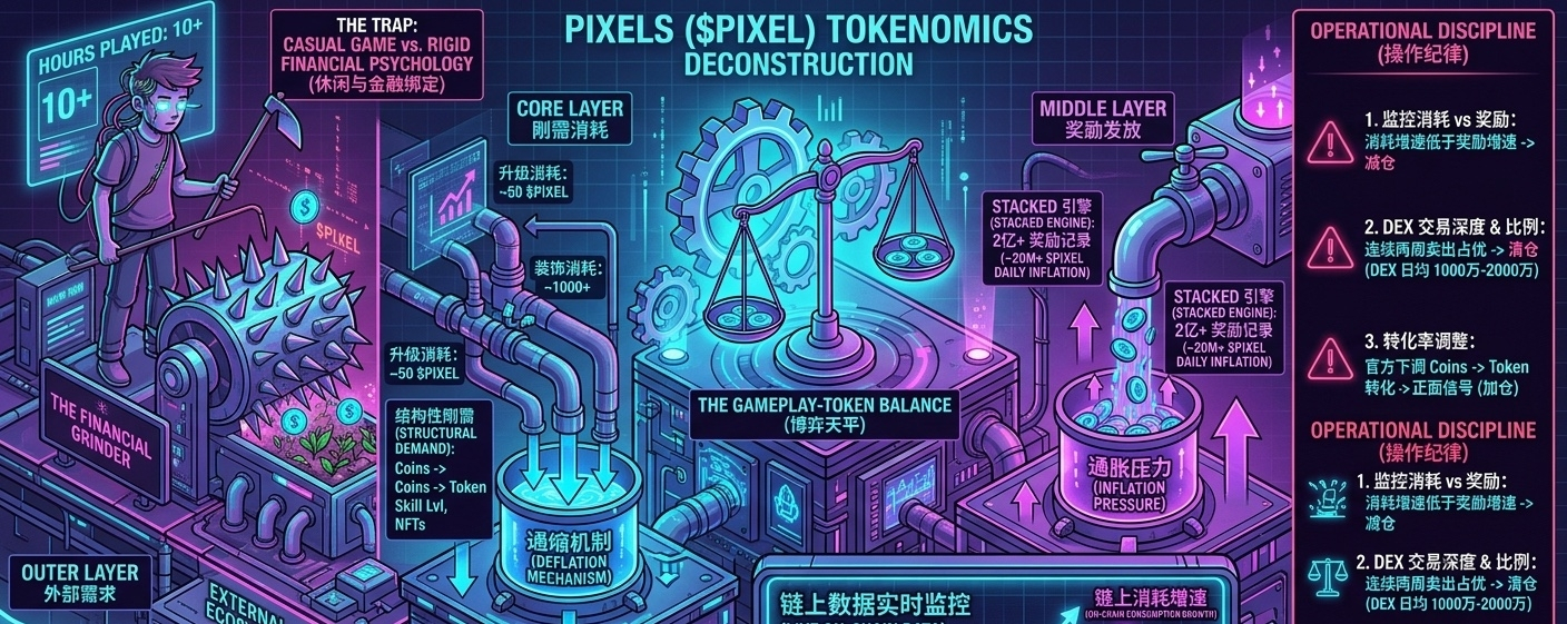 拆解它的通缩机制,我把它切开来看。核心层是游戏内刚需消耗——Coins 转代币的转化通道、技能升级的代币消耗、稀有装饰品的定价。这些消耗是结构性的,只要玩家在玩,就在持续消耗代币。中间层是 Stacked 引擎的奖励发放——每次奖励都是代币从系统流向玩家,这部分是通胀压力。更外围的支撑则是外部生态接入——当 Stacked 向外部工作室开放,代币作为结算燃料被用于跨游戏奖励,这部分是新增需求面。$PIXEL
