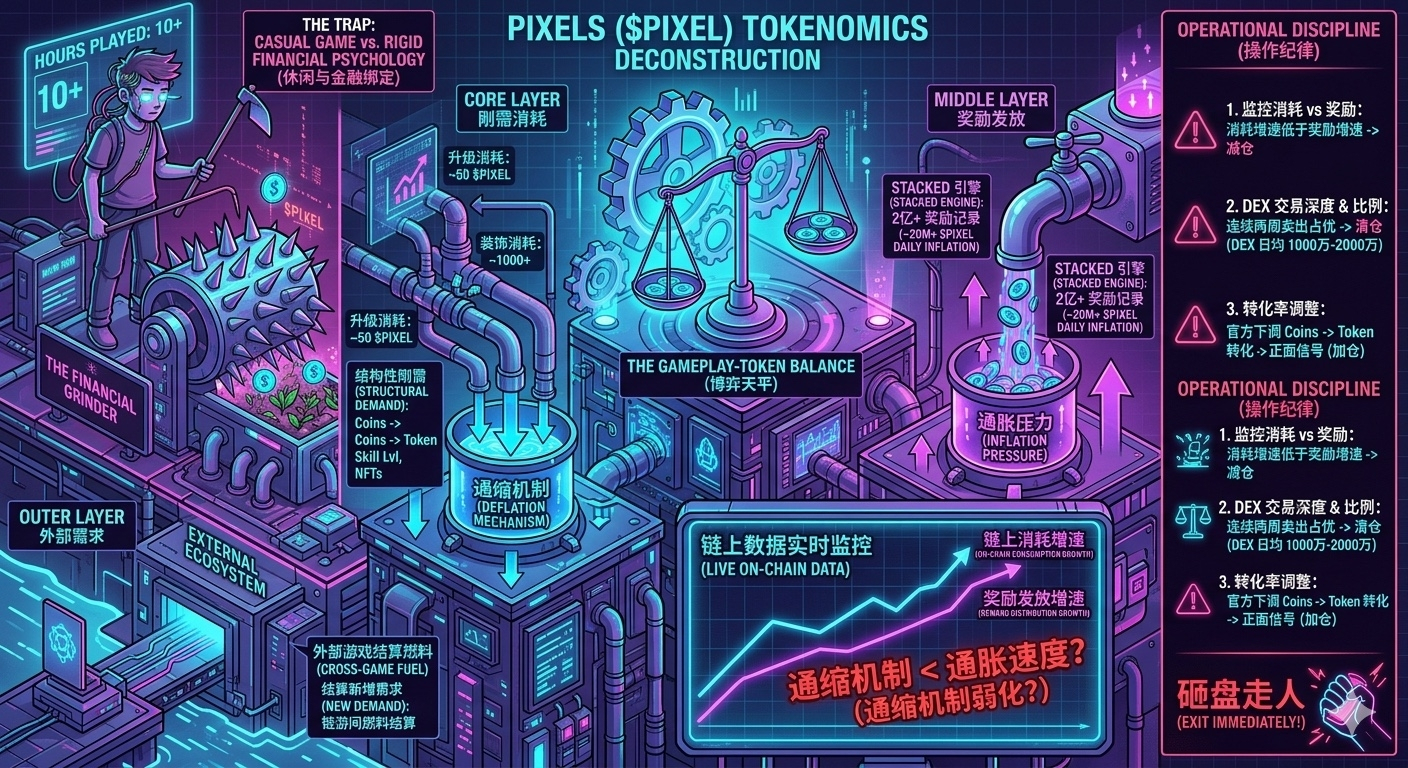 操作纪律不能含糊:追踪游戏内消耗量的月度变化,如果消耗增速低于奖励发放增速,说明通缩机制在弱化,减仓;监控 DEX 上大额买入卖出比例,连续2周卖出占优说明大户在离场,清仓;关注官方是否调整 Coins 转代币的转化率,如果转化率下调,说明团队在控制通胀速度,这是正面信号,持有或加仓。别信社区喊“游戏好玩所以币会涨”,看链上消耗数据和交易深度。当休闲游戏被迫承载金融属性,所谓的“好玩”就是个伪命题。在 #pixel 的经济模型里,我只认链上的通缩数据,如果消耗跟不上通胀,这游戏画风再治愈,我也会毫不犹豫地砸盘走人。