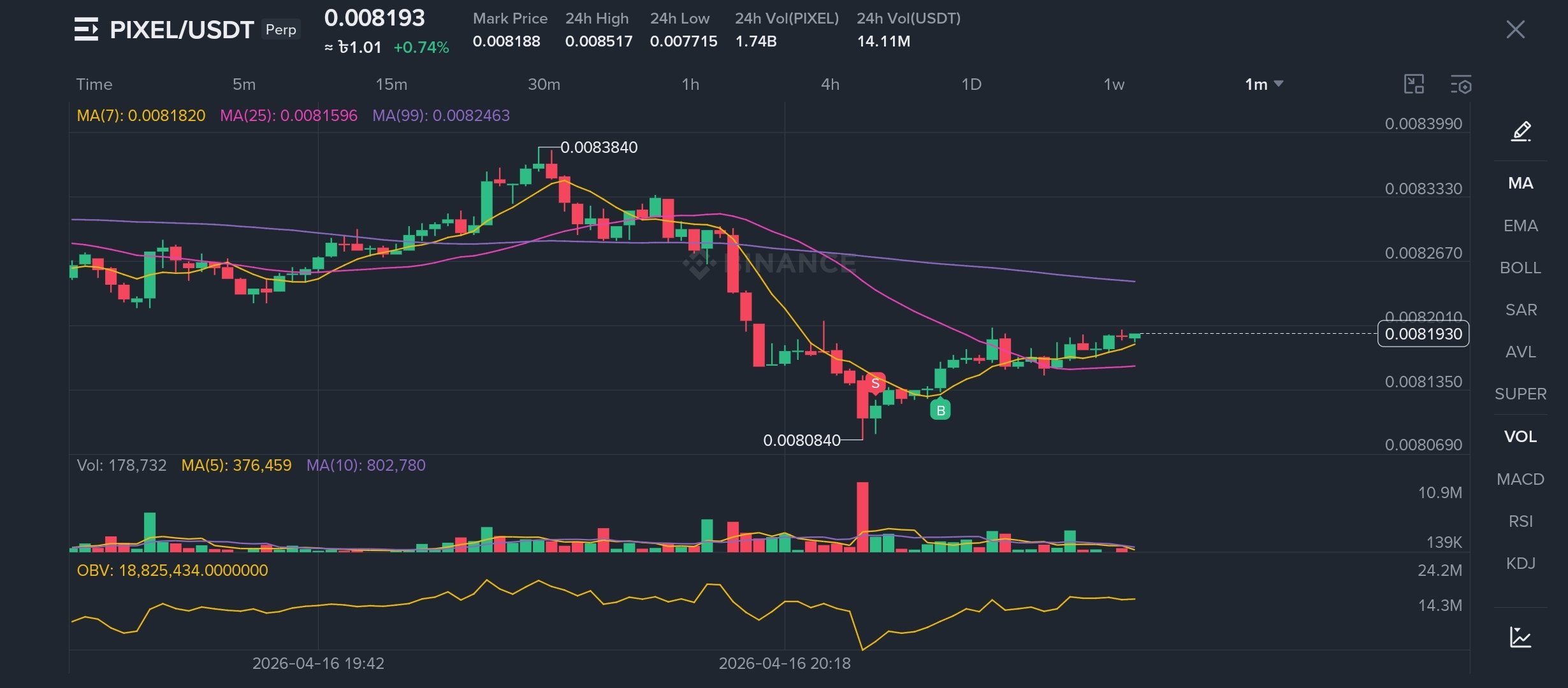 Just had one of those “lesson learned” days in crypto. I took a small futures position on $PIXEL today after seeing some bullish momentum building on the chart. The price was hovering around 0.00819 with a slight +0.74% move, trying to recover from earlier dips. Looking at the 1-minute/5-minute chart, it had climbed to about 0.008384 earlier, then pulled back sharply before bouncing with some green candles. Volume was decent, and the moving averages were showing mixed signals — short-term ones flattening while longer ones still pointed slightly upward.