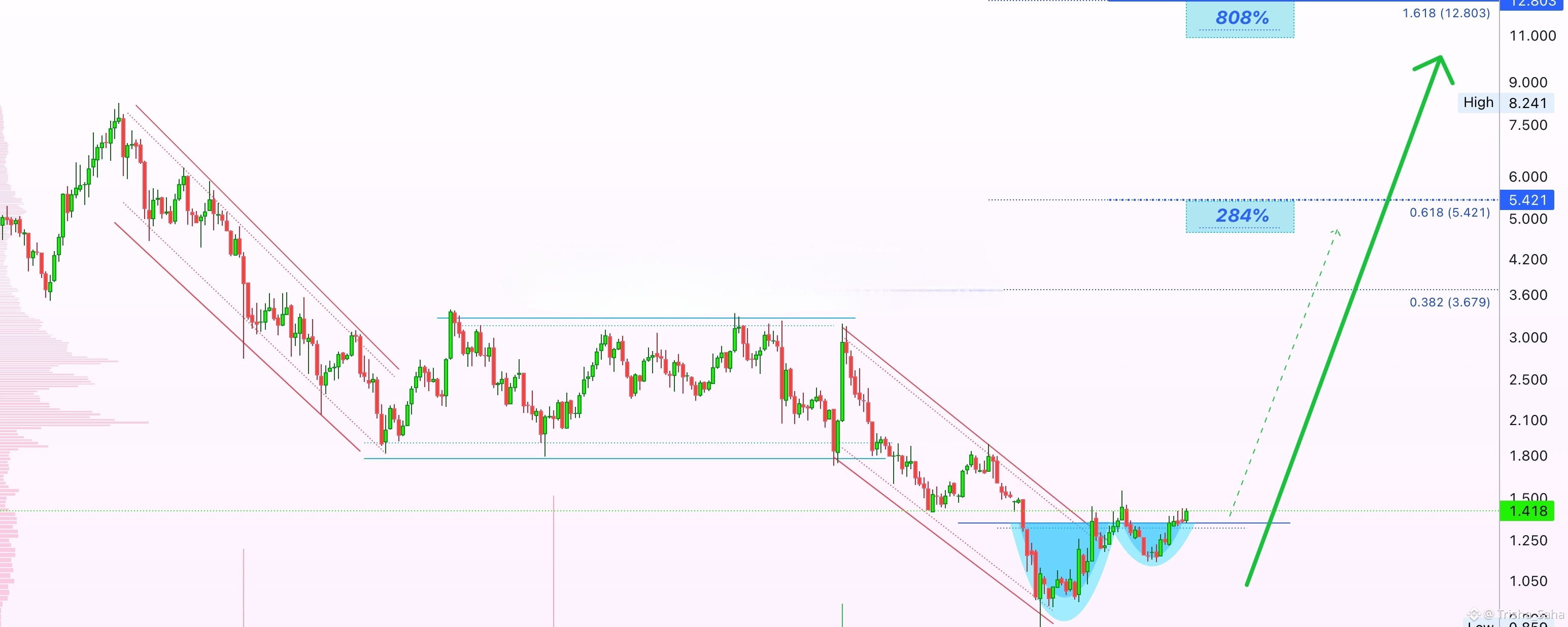 В последний раз #Near рост 800% был в 2023-2024, октябрь-март, и это был конец движения. Рынок затем двигался в боковом направлении, за которым последовала серьезная коррекция. Эта коррекция закончилась два месяца назад.