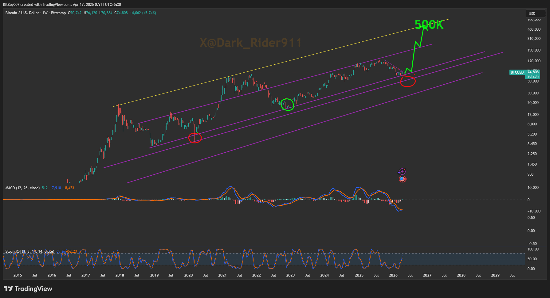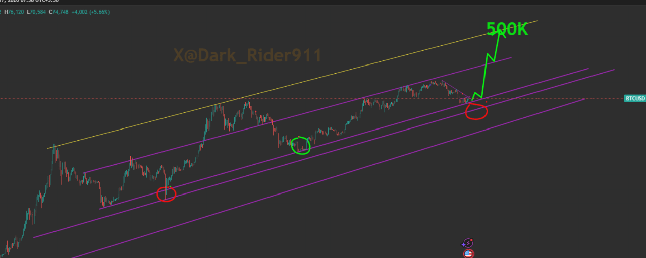Цена очень вероятно будет колебаться на / вокруг этой фиолетовой трендовой линии (некоторое колебание, повторные тесты, возможно, небольшая испуг-нижняя тень) перед тем, как взлететь к цели 500K. Это классическое поведение цикла — трендовая линия действует как динамическая поддержка, цена "идет по ней" некоторое время (фаза консолидации), затем начинается настоящий параболический рост, как только она преодолевает следующую фиолетовую сопротивление выше. Мы не пробиваем эту трендовую линию в базовом сценарии, который показывает этот график. Вся установка (множественные трендовые линии + исторические аналоги красного круга + большая зеленая стрелка 500K) является бычьим продолжением, а не разворотом. Итог (мое мнение, напрямую из этого графика):