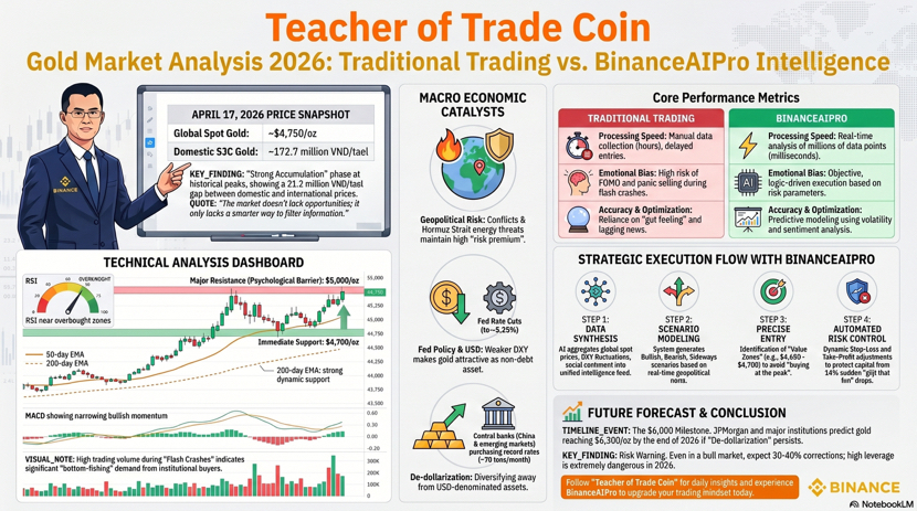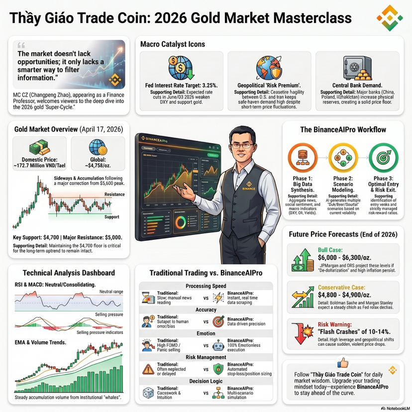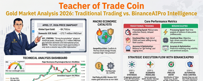 Chào anh em, thầy giáo trade coin đây, sáng 17 tháng 4 năm 2026 mình mở chart vàng ra và cảm giác đầu tiên là thị trường đang rất biết cách làm khó người hay nóng tay: vàng giao ngay đang lình xình quanh vùng 4793 đến 4799 đô la mỗi ounce, biên độ trong ngày khoảng 4767.8 đến 4806.31, còn vàng tương lai quanh 4817 đến 4818 đô la, và bức tranh chung vẫn là một nhịp tăng kéo dài sang tuần thứ tư liên tiếp nhờ kỳ vọng đàm phán hòa bình Mỹ Iran tiến triển cùng đồng đô la mềm hơn. ([Investing.com][1]) Nói vui chút thì nếu giao dịch vàng mà chỉ nhìn mỗi một cây nến rồi vội đặt niềm tin vào vũ trụ, rất dễ bị thị trường cho một bài học miễn phí nhưng không hề rẻ. Với mình, vàng luôn là môn thể thao của kỷ luật hơn là của cảm xúc, vì nó phản ứng cực nhanh với tin tức, lợi suất, đồng bạc xanh và tâm lý trú ẩn, nên ai càng cố đoán mò càng dễ tự bẫy mình. Còn đây chính là chỗ BinanceAIPro bắt đầu phát huy giá trị rất thật: Binance mô tả đây là bản beta của một trợ lý AI có thể phân tích điều kiện thị trường, hỗ trợ chiến lược và quản lý quy trình giao dịch đầu đến cuối, truy cập qua Binance Ai trên app Android hoặc trang chủ web Binance. ([Binance][2]) Nhưng mình nói rõ luôn, AI không phải cây đũa thần đổi lệnh thua thành lệnh thắng, nó là cái bộ lọc nhiễu cực mạnh nếu bạn biết hỏi đúng câu hỏi. Truyền thống thì mình từng trade kiểu rất quen thuộc của anh em crypto đời đầu, mở chart, kéo RSI, MACD, Fibo, đọc vài tin tức, rồi tự kết luận bằng cái cảm giác rất người là tôi thấy nó sẽ lên. Cách đó không sai, nhưng nó có một vấn đề kinh điển: đầu người thì giới hạn, còn thị trường thì không. Khi có quá nhiều dữ liệu, chúng ta thường chọn dữ liệu hợp với niềm tin sẵn có, chứ không phải dữ liệu hợp với sự thật. BinanceAIPro đối với mình giống như một người phụ tá cực chăm, không cãi lại sếp nhưng cũng không để sếp mơ mộng quá đà. Thay vì hỏi AI vàng hôm nay có tăng không, mình hỏi nó theo kiểu chuyên nghiệp hơn: bối cảnh hiện tại đang ủng hộ xu hướng nào, vùng nào là vùng xác nhận, vùng nào là vùng phủ định, kịch bản nào có xác suất cao hơn nếu đồng đô la mạnh lên hoặc yếu đi, và đâu là phần tin tức có thể làm giá vàng giật bất ngờ. Chính cách đặt câu hỏi đó đã thay đổi chất lượng quyết định của mình.