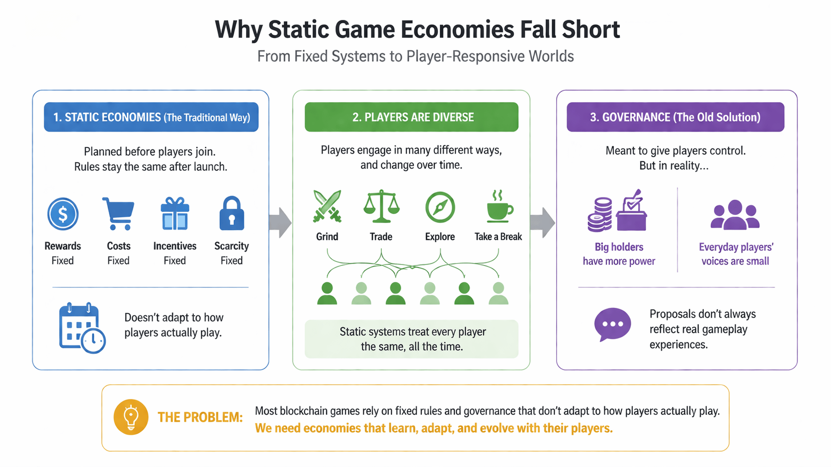 Это заставило меня задуматься о более серьезной проблеме, с которой сталкиваются большинство блокчейн-игр. Чаще всего они заранее планируют свои экономики. Прежде чем игроки даже присоединятся, они знают, каковы награды, затраты и стимулы. После запуска большая часть этого зависит от фиксированных токеновых систем и дефицита, чтобы сохранить справедливость.