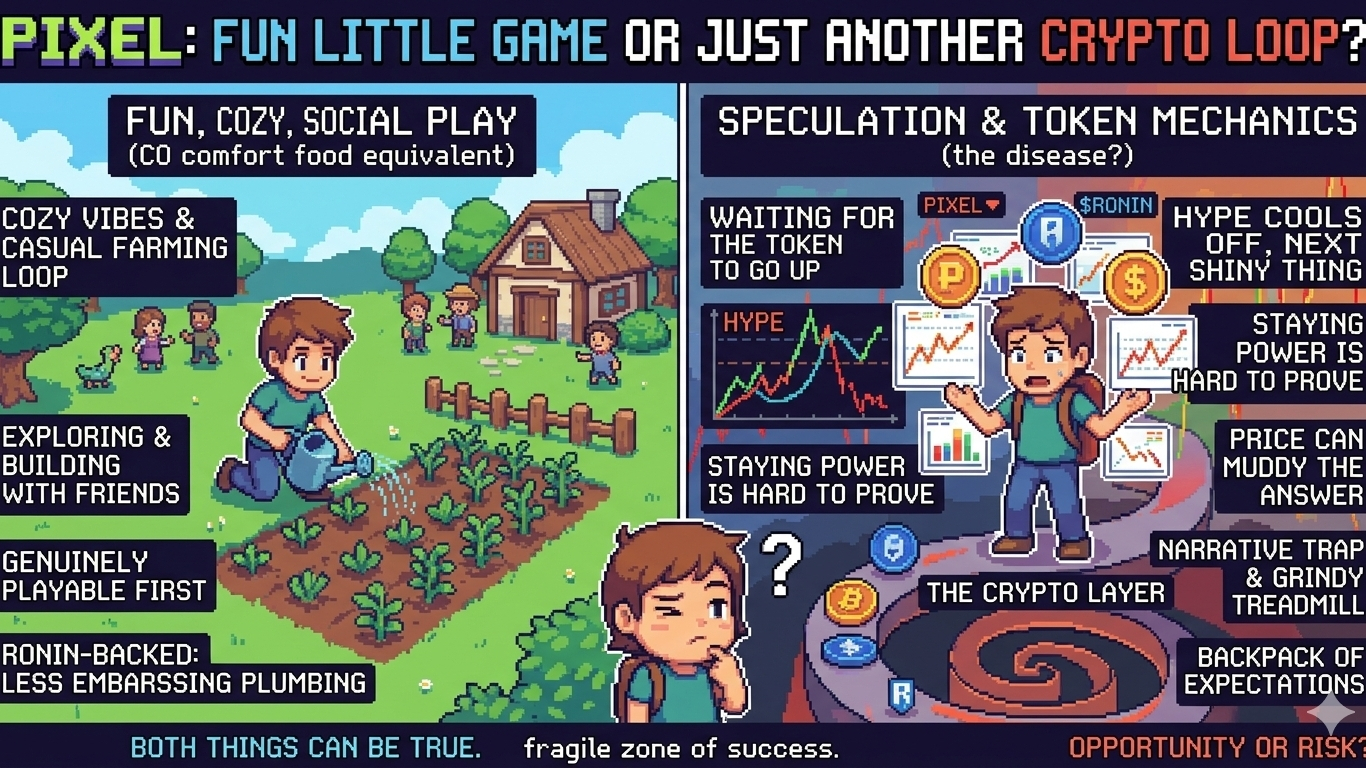 Но да, всегда есть крипто-слой, сидящий под милой поверхностью игры, и именно здесь мой мозг начинает делать маленькое боковое движение. Потому что игры в Web3 всегда звучат лучше в презентации, чем в потном реальности того, продолжают ли люди действительно приходить, когда токен становится странным, или хайп утихает, или появляется следующая блестящая вещь. PIXEL кажется, что он пытается избежать этой ловушки, будучи искренне играбельным в первую очередь, что умнее, чем большинство этого сектора, но я все еще не полностью доверяю жанру. Я видел слишком много проектов, где «весело» в конечном итоге означает «временное отвлечение перед тем, как цифры станут уродливыми».