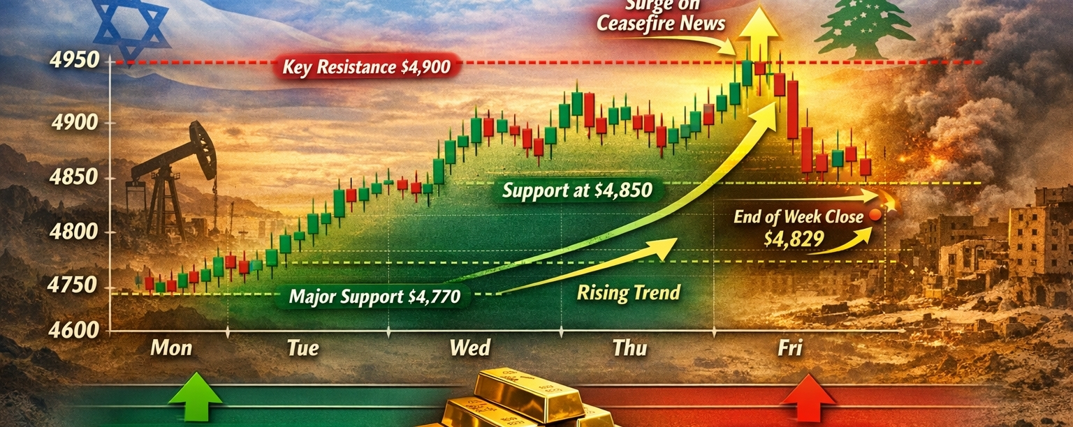 Основной поворотный момент произошел в пятницу утром, когда начали циркулировать новости о региональной стабильности. В течение нескольких часов золото резко подскочило — с около $4,786 до выше $4,890 — что стало самым агрессивным ралли недели. Этот скачок совпал с официальным подтверждением того, что пролив снова открылся, за которым последовали политические одобрения соглашения о прекращении огня.