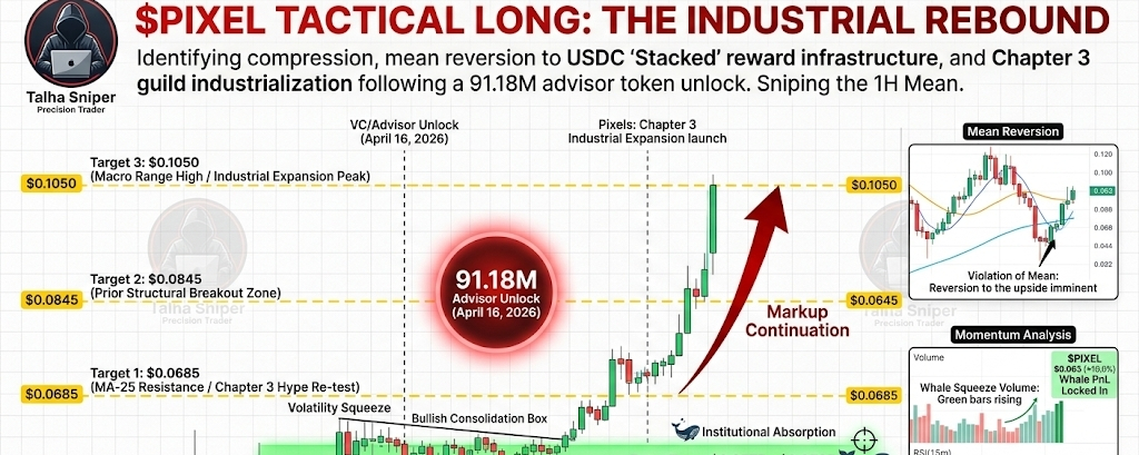$PIXEL is currently in a "Buy the Dip" zone following the advisor unlock. The 1-hour chart shows price compression near the MA-99 confluence, suggesting the worst of the dilution pressure is over. With the Chapter 3 mechanics requiring players to spend $PIXEL for premium tasks and guild expansion, the fundamental demand is decoupling from pure speculation. We are sniping a long position here, betting on the "Stacked" USDC reward model to significantly reduce sell-pressure and trigger a relief rally toward $0.08.