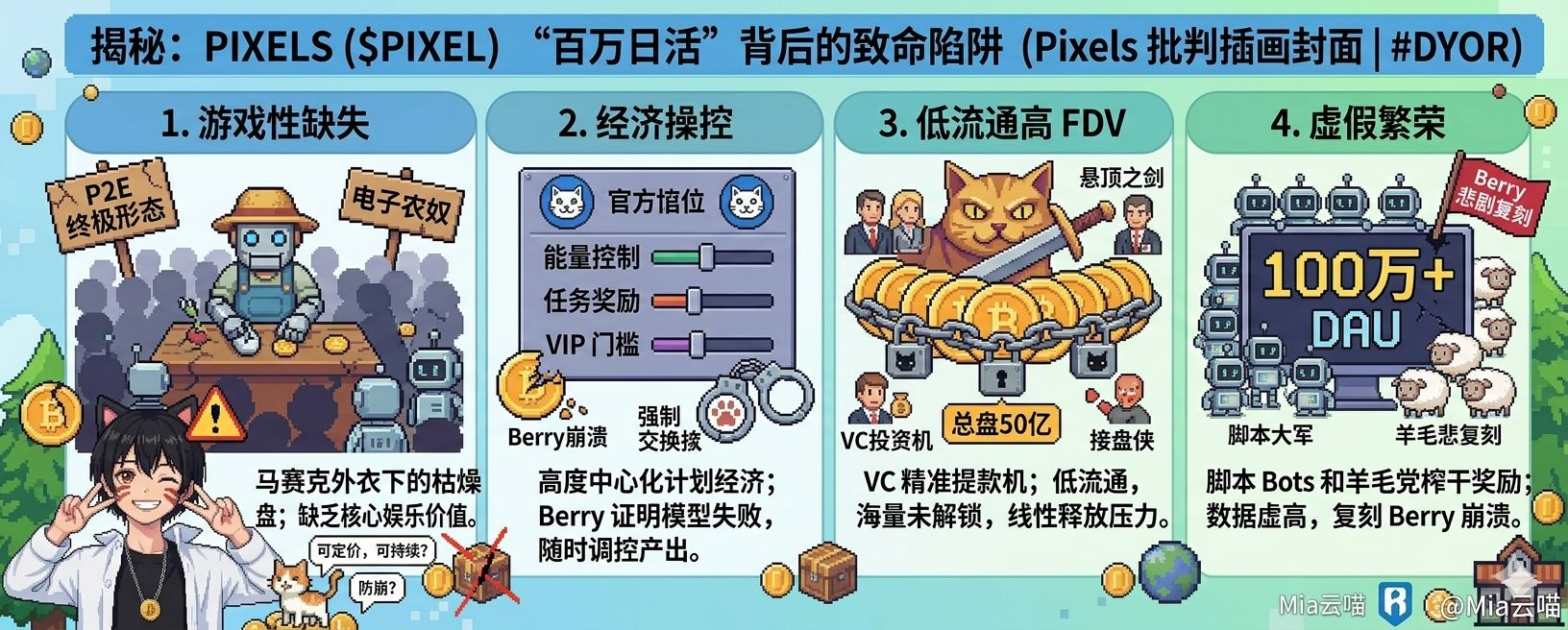 老实说,在币圈经历过 Axie Infinity 的大起大落,我不排斥项目方讲“可持续经济”的宏大叙事,毕竟有热度才有流动性。但做交易最怕的,就是散户把 VC 和项目方编撰的“像素乐园招股书”当成了不容置疑的真理。今天咱们就继续当这个恶人,拿放大镜照一照这个号称要重塑链游的 Pixels 底裤,看看这盘像素大棋里,谁才是真正的“电子农奴”。