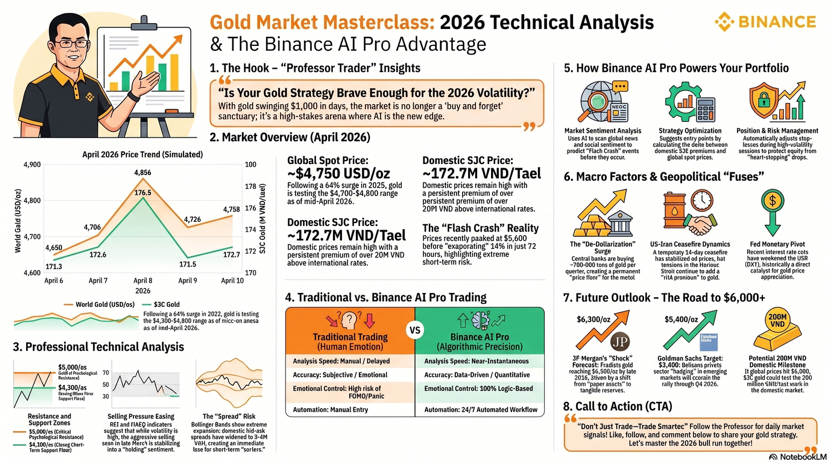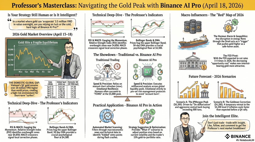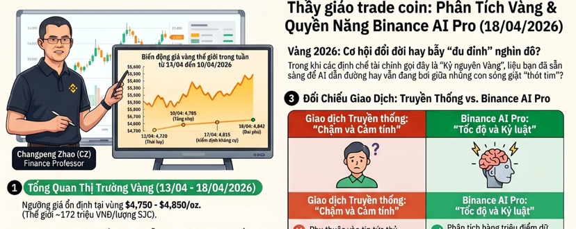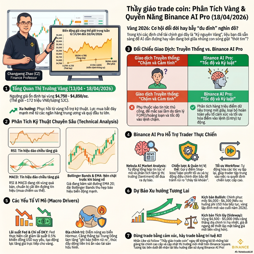 Chào anh em, tôi là thầy giáo trade coin, hôm nay mình nói chuyện vàng theo kiểu của một người sống cùng chart chứ không phải chỉ sống cùng cảm xúc. Phiên gần nhất, vàng tiếp tục giữ nhịp cực nóng khi Reuters ghi nhận spot gold lên quanh 4861.32 USD mỗi ounce vào ngày 17 tháng 4, sau một chuỗi dao động mạnh từ vùng 4734.50 ngày 13 tháng 4 lên 4798.89 ngày 15 tháng 4 rồi 4785.57 ngày 16 tháng 4, tức là thị trường đang đi theo đúng kiểu pullback nông, bật lại nhanh và vẫn giữ cấu trúc tăng. Động lực chính vẫn là đồng đô la mềm hơn, kỳ vọng nới lỏng lãi suất và bối cảnh địa chính trị còn chưa chịu ngồi yên, nên vàng vẫn là nơi dòng tiền tìm đến khi muốn trú ẩn. Reuters còn ghi nhận một số góc nhìn cho rằng vàng có thể hướng lên mốc 5000 trong ngắn hạn nếu môi trường hiện tại tiếp tục giữ nguyên. ([Reuters][1]) Nếu nhìn bằng mắt trader, đây là một mẫu chart rất đẹp nhưng cũng rất dễ làm người ta chủ quan. Vàng không cho ai ăn miễn phí. Nó chỉ cho cơ hội. Và ai không có kỷ luật thì cơ hội nào cũng thành bài học đóng học phí. Với cách trade truyền thống, tôi thường phải tự đọc tin, tự soi chart, tự đánh dấu vùng cung cầu, tự kiểm tra lịch vĩ mô, rồi tự ngồi cãi nhau với chính mình xem nên vào hay chờ thêm một cây nến xác nhận. Cách đó không sai, thậm chí còn rất cần thiết để một trader trưởng thành. Nhưng nhược điểm là quá tốn thời gian và quá dễ bị cảm xúc bẻ lái. Chỉ cần một cú nhấp nhổm của giá, một headline địa chính trị, hay một phiên biến động mạnh là bộ não người rất dễ biến thành con gà chạy loạn trong chuồng. Còn khi tôi thử đưa Binance AI Pro vào workflow, cảm giác giống như có một trợ lý ngồi cạnh bàn trade, lọc bớt nhiễu và giữ cho đầu óc mình tỉnh hơn. Theo Binance, Binance AI Pro là một AI trading assistant có thể hỗ trợ phân tích thị trường, thực thi giao dịch, theo dõi tài sản, tạo AI trading account riêng với API key có quyền hạn giới hạn, tách biệt với tài khoản chính để quản lý rủi ro tốt hơn, và có thể kích hoạt qua app hoặc web. ([Binance][2]) Điểm tôi thích nhất không phải là chữ AI cho sang, mà là cách nó ép quy trình trading của mình phải rõ ràng hơn.