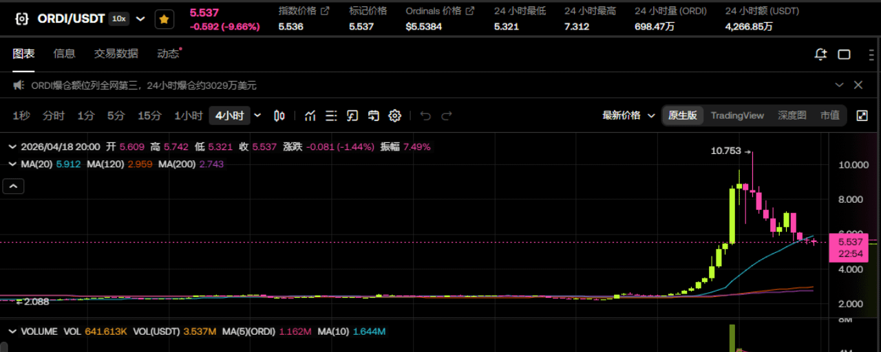 除了大饼走了一波上涨行情之外,就连沉寂了两年多的 ORDI 也直接从 2 美金拉到最高 10 美金,目前回撤到 5 美金左右。