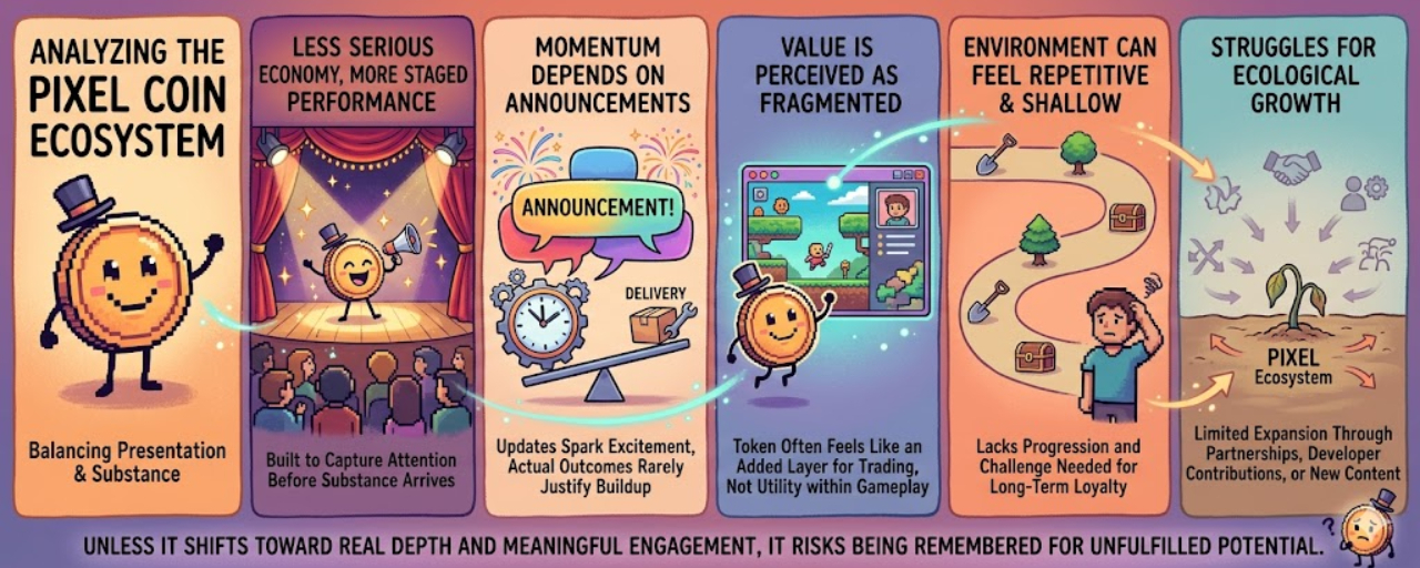 Ultimately, PIXEL coin highlights a recurring issue in crypto: projects that master presentation but fall short on delivery. It captures attention through visuals and narrative, yet fails to anchor itself in strong execution or lasting utility. Unless it shifts toward building real depth, meaningful engagement, and a clear purpose for its token, it risks being remembered not for innovation, but as another example of potential that never fully materialized.
