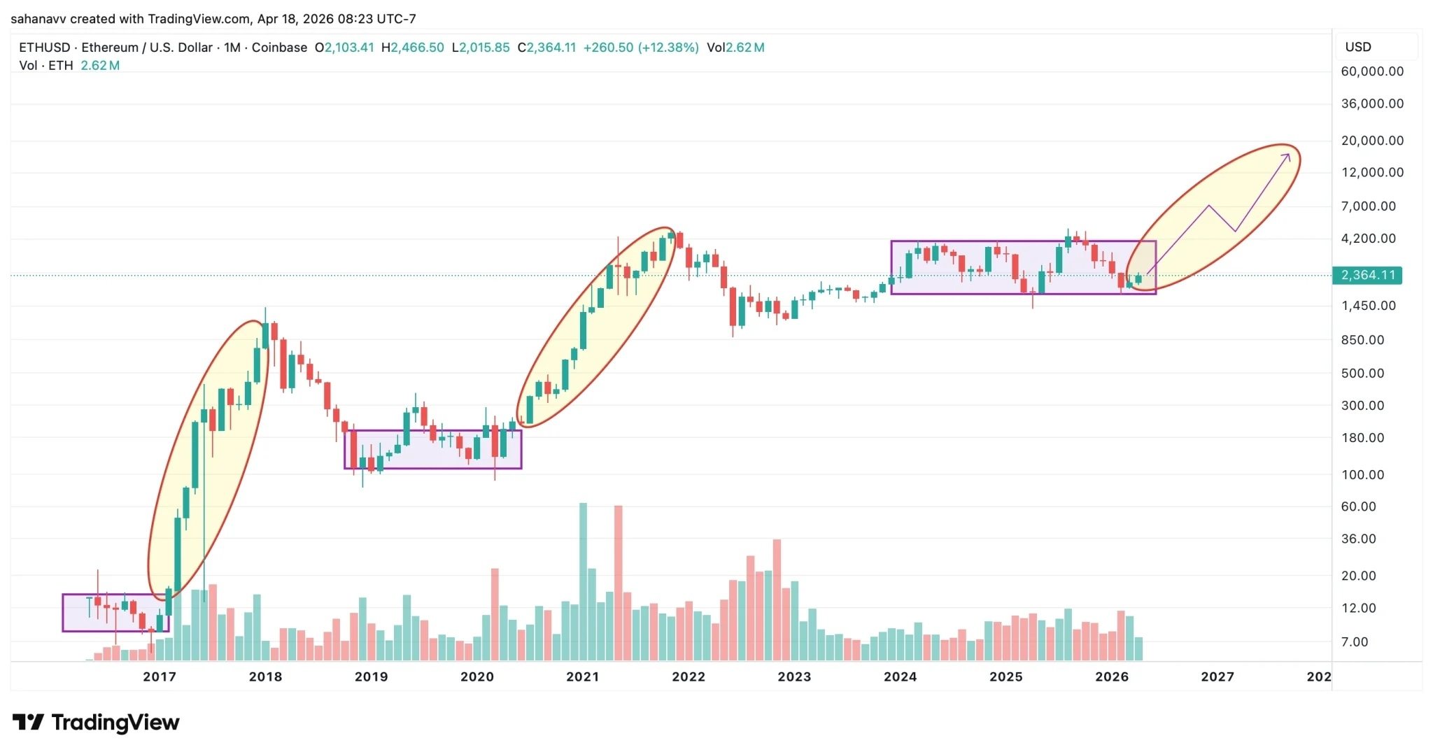 The current structure between roughly $2,000–$4,000 looks similar to previous accumulation zones that eventually led to strong upside expansions. Price is compressing, volatility is cooling, and the market is building a base rather than trending aggressively. If this pattern continues, the next phase would be a breakout from this range, potentially leading to a new expansion leg. The projected move, based on previous cycles, points toward a gradual climb rather than a straight rally, likely forming higher highs along the way.
