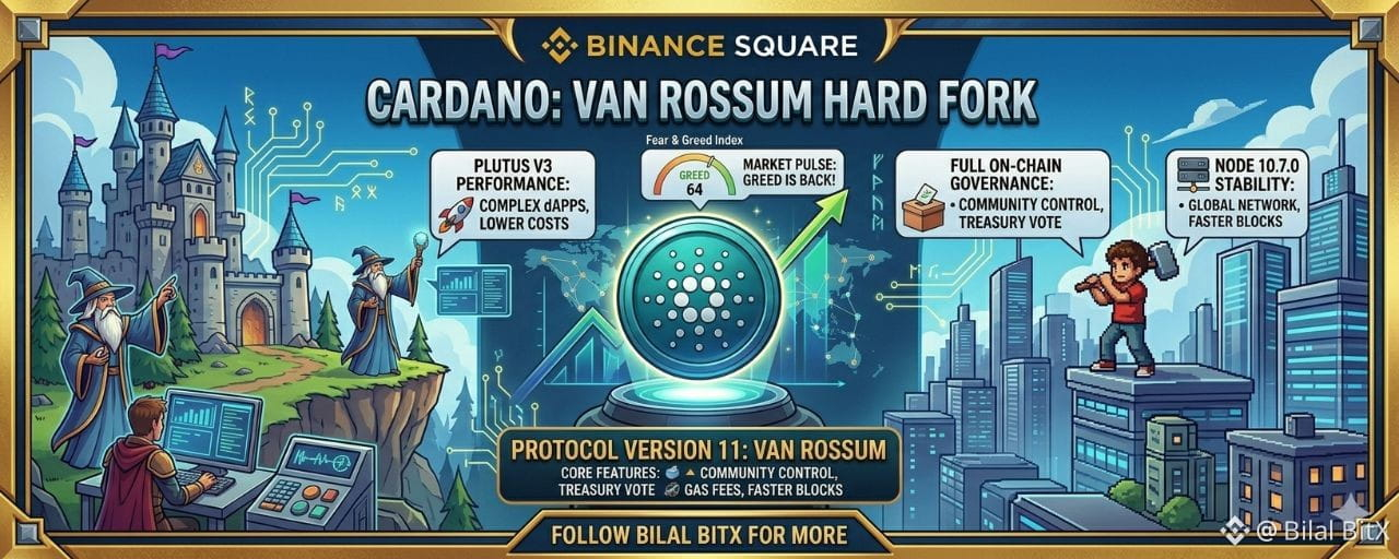The Van Rossum upgrade isn't just a "patch"—it's the foundation for the next wave of Cardano DeFi. With the market entering a "Greed" phase, watch for high-utility projects like $ADA to lead the narrative as fundamental value meets improved market liquidity.