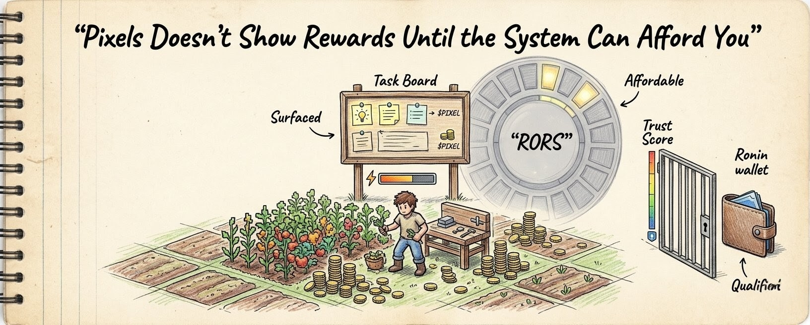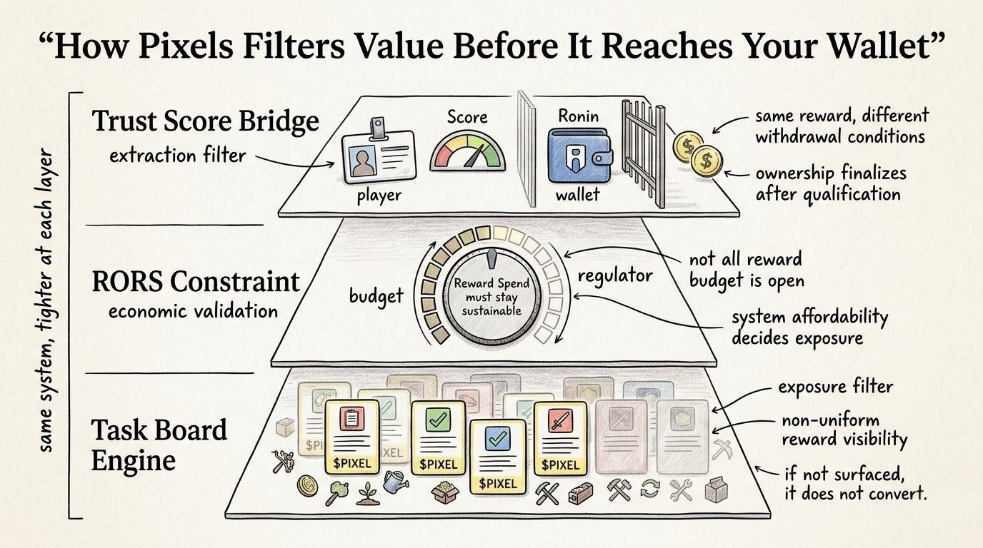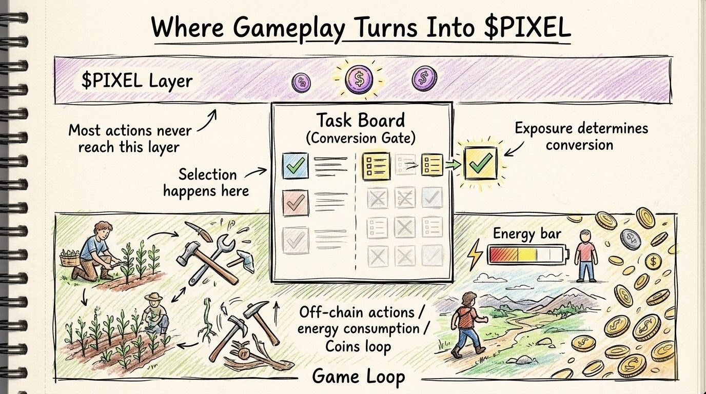 on Pixels, time i spend inside it, the less it feels like i’m earning anything and more like something is being directed at me. when a Task completes and pixels shows up, it still looks the same… same board, same completion, same token… but it doesn’t feel like it came from what i just did. it feels like it came from somewhere else, like something above the loop already decided value needed to move… but not everything i do is even allowed to carry it.
