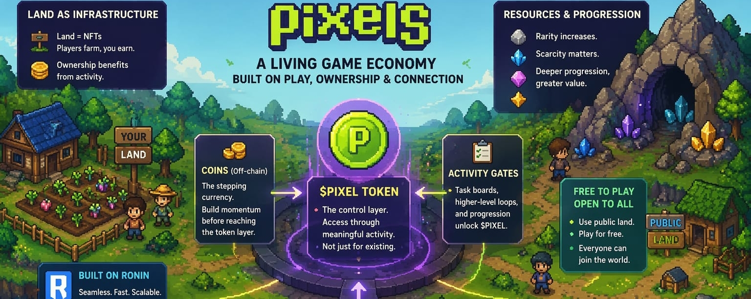 Pixels doesn’t try to impress you by announcing itself as “the future.” It behaves more like something you gradually understand. At first, it looks like a quiet farming world—plant crops, gather wood, cook food, walk around. But the longer you stay, the more it becomes clear that every simple action is wired into a system where time, ownership, and coordination are constantly being measured and redirected.