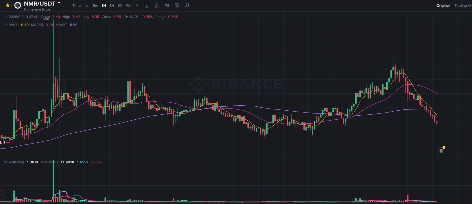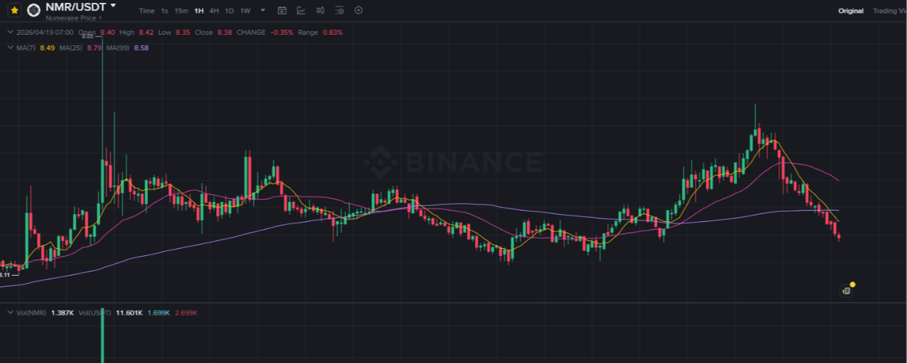 Based on the hourly chart provided for April 19, 2026, NMR/USDT is currently trading at $8.38. The asset has recently retreated from its local high of $9.85 and is currently testing a significant support zone formed by the 99-period Moving Average (purple line) and previous horizontal consolidation.