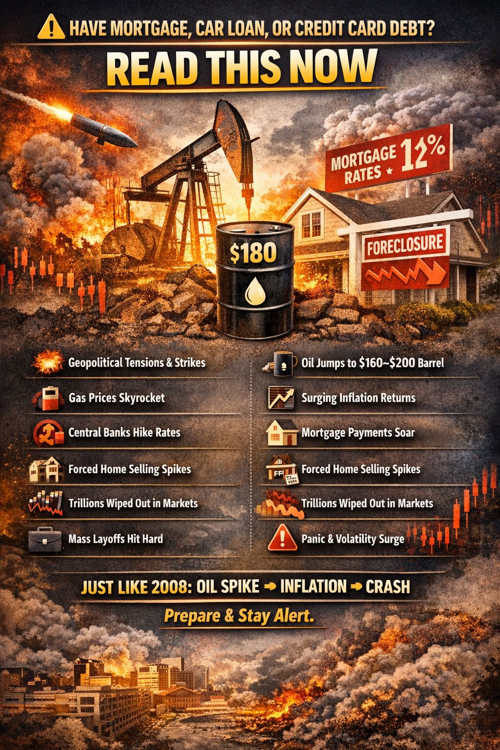 Мы уже видели подобную цепную реакцию в 2008 году: Резкий рост цен на нефть → Инфляция → Повышение ставок → Обвал рынка жилья → Увольнения → Ипотечные взыскания