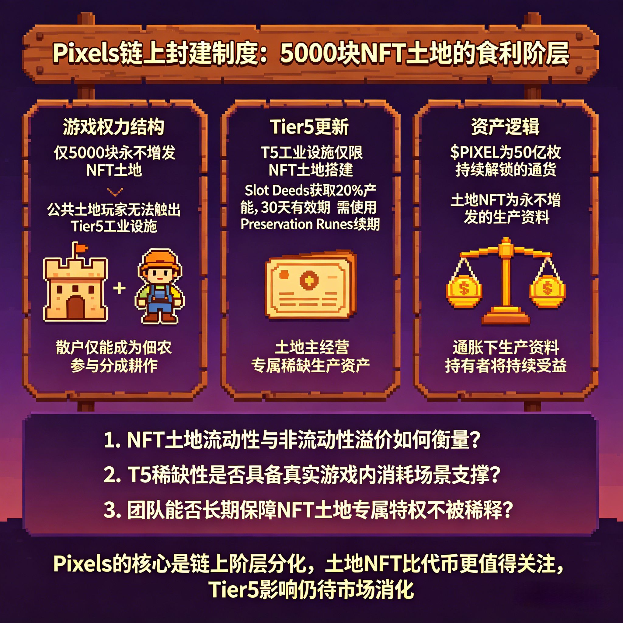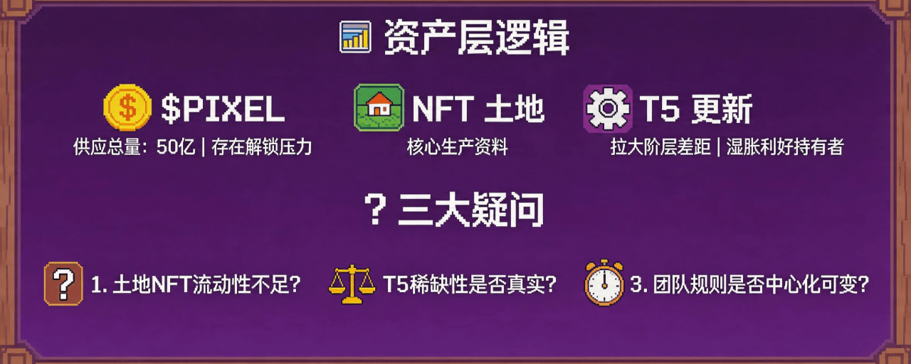你想想:PIXEL 总供应 50 亿枚,持续解锁,市场压力是实打实的。但 NFT 土地只有 5000 块,不增发,随着游戏内内容不断叠加(T5 之后还会有 T6 吗?),每一层新内容可能都会进一步扩大土地主和普通玩家之间的经济鸿沟。