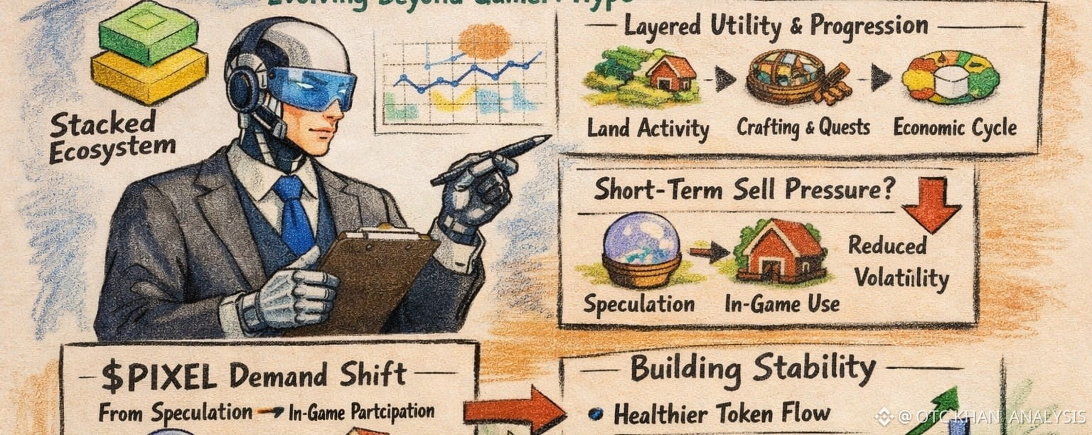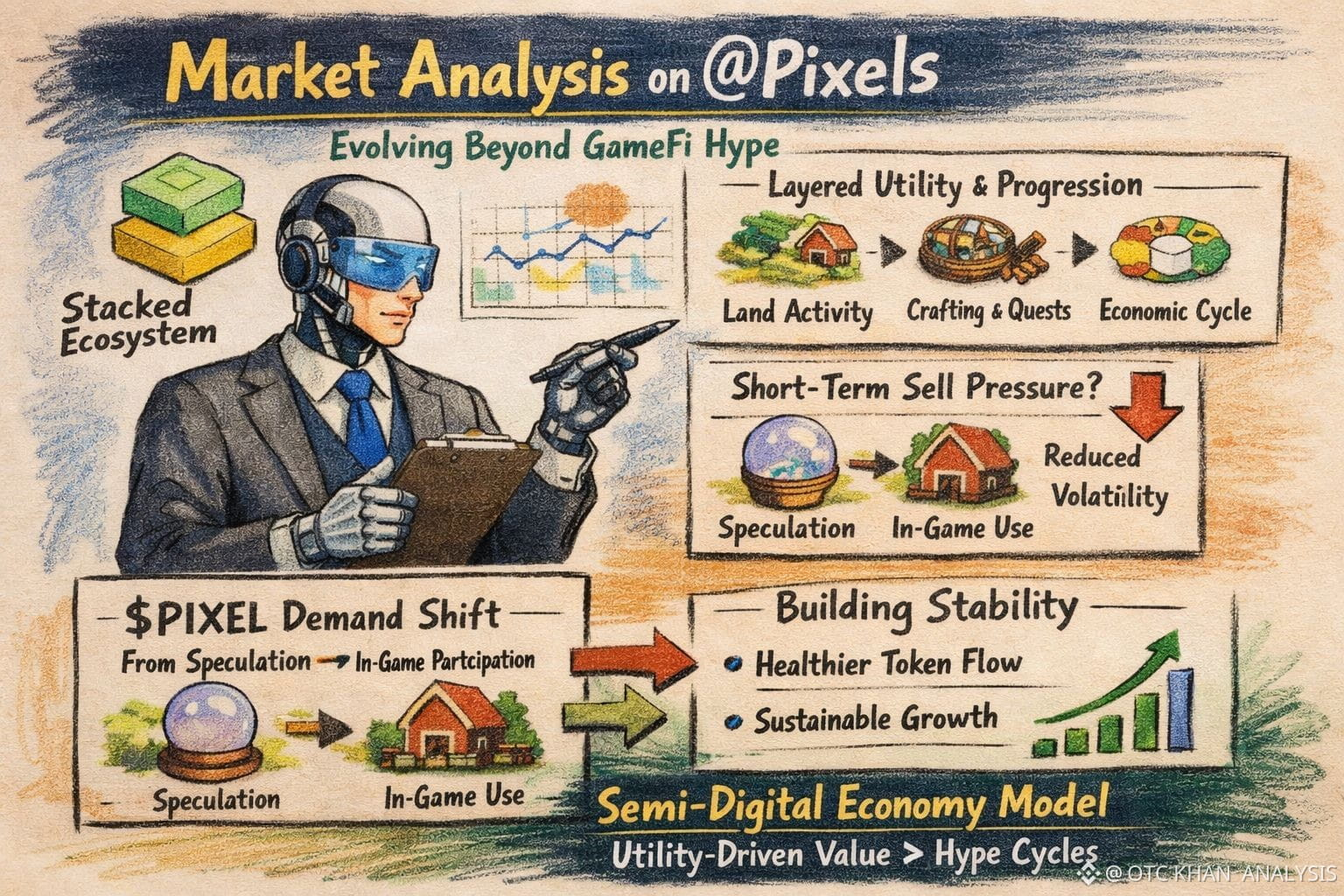 Market analysis (humanoid perspective) on @Pixels shows a clear shift from simple GameFi hype toward a structured in-game economy driven by its Stacked ecosystem. Instead of relying only on reward farming cycles, Pixels is building layered utility where land activity, crafting systems, and progression mechanics continuously circulate value inside the ecosystem. This reduces sudden sell pressure that is commonly seen in short-term GameFi projects.