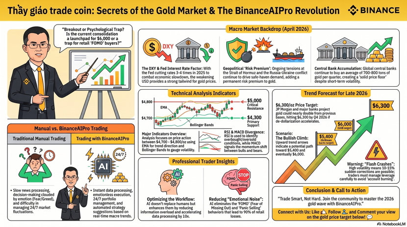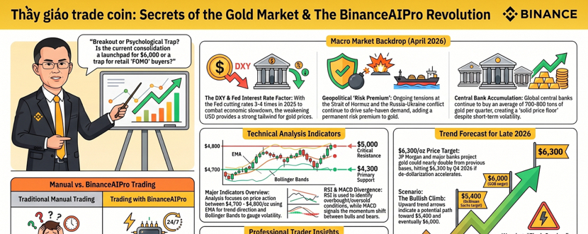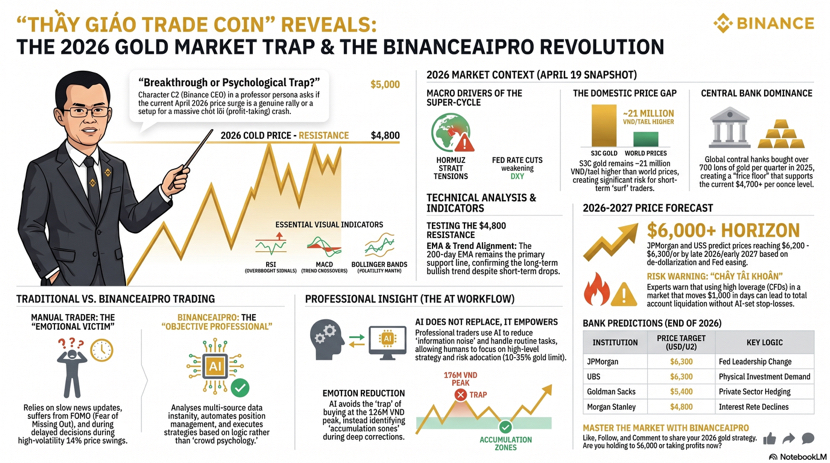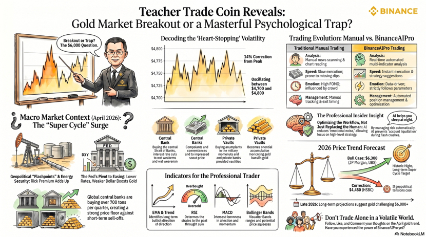 Hello everyone, I am thầy giáo trade coin, and if you are watching gold today on April 19, 2026, the market feels less like a sleepy hedge and more like a very expensive soap opera with a chart attached. By the latest Reuters prints this week, spot gold has been swinging from about 4654.99 on April 6 to 4831.78 on April 14, then 4785.57 on April 16, and 4861.32 on April 17, which tells me the broader bias is still bullish but the tape is clearly moving in bursts, not in a clean straight line. The main drivers behind that move have been a weaker dollar, shifting expectations around US rate cuts, and the market mood around US Iran developments, with Reuters noting that gold has been supported when the dollar softens and oil eases, and pressured when inflation fears or a stronger dollar return. ([Reuters][1]) From a trader’s point of view, that matters because gold is not just a shiny line on a chart. It is a live opinion poll on fear, liquidity, rates, and geopolitics, all fighting each other in real time. When I read the chart today, my first impression is simple. Buyers still have control, but the market is now at the stage where impatience gets punished. Late longs chase green candles, early shorts get run over, and the smartest move is often to wait for confirmation instead of trying to be the hero who sells the top because the internet told him gold looks tired. That is exactly where the difference between traditional trading and BinanceAIPro becomes very obvious. In the traditional style, I would open multiple tabs, check the dollar, skim headlines, stare at price action, compare higher timeframe structure, then manually decide whether the move is a continuation or just emotional noise. That process works, but it is slow, and in a market like gold, slow can feel like trading in slippers during a race. BinanceAIPro is built for a different rhythm.