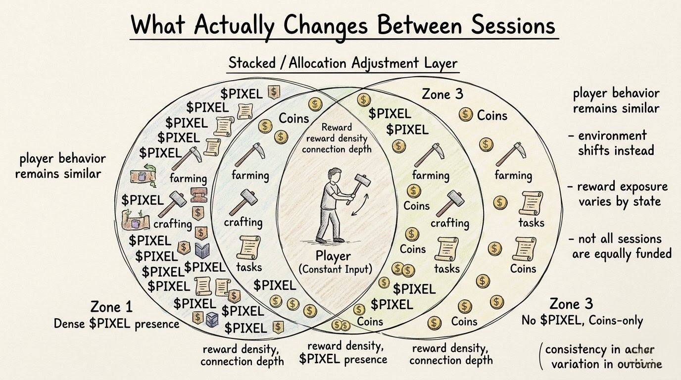 Pixels tacked keeps coming back into my head here, not as a feature… just as a behavior already happening somewhere above the board. if something is actually analyzing players over time, looking at patterns, retention, who stays, who leaves, what changes when reward exposure shifts… then what am i inside right now, a game or a test environment shaped through different board states that are already constrained by where liquidity is actually being directed.