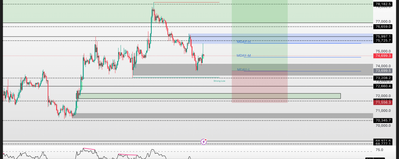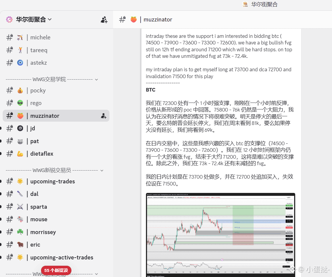根据 muzzinator 的分析,如果价格跌破这一水平,意味着 12 小时级别的 FVG 支撑已经崩塌,且短期支撑结构(72,300 附近的 1 小时支撑)彻底失效。他制定的 DCA 计划从 73,700 延伸到 72,700,这 1,000 点的区间是他博弈反弹的空间,而 71,500 就是他最后的尊严线。