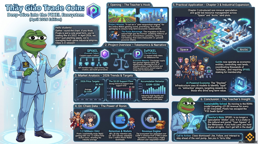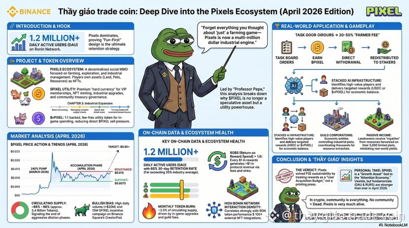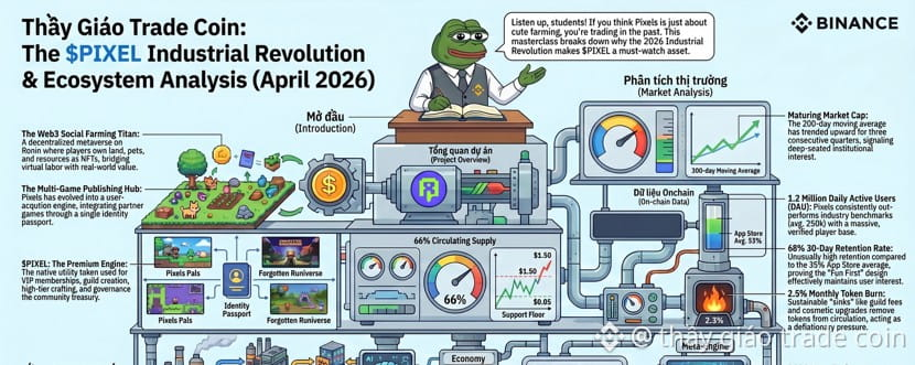 Chào anh em, mình là thầy giáo trade coin đây, hôm nay mình không mang phấn bảng nhưng mang hẳn một góc nhìn rất thật về Pixels và hệ sinh thái Pixels theo kiểu vừa có tín hiệu thị trường vừa có chút mùi của game vừa có chút mùi của cơ hội dành cho người thích săn narrative hơn là chỉ nhìn nến đỏ nến xanh mà hoảng hồn. Có một sự thật rất thú vị là trong crypto, token nào chỉ biết chạy theo sóng thì thường lên nhanh nhưng cũng nằm sấp nhanh, còn token nào có hệ sinh thái đủ dày, đủ giữ chân người dùng, đủ tạo ra hành vi lặp lại thì nó mới có cơ hội đi đường dài. Và Pixels đang là một cái tên mình thấy đáng để anh em mở mắt nhìn kỹ hơn thay vì lướt qua như lướt một status cho vui. Nếu nhìn dưới góc độ thị trường, pixel không chỉ là một token của một trò chơi web3 đơn lẻ mà nó đại diện cho một hệ sinh thái có định hướng rõ về trải nghiệm người dùng, về vòng lặp phần thưởng, và về việc biến việc chơi game thành một thói quen có thể tạo ra giá trị thực trong nội bộ hệ. Nói nôm na dễ hiểu thì đây không phải kiểu dự án chỉ dựng lên một cái game rồi treo token cho đẹp, mà là một câu chuyện lớn hơn về việc xây một nền kinh tế nhỏ bên trong thế giới giải trí số. Cái này mới là thứ khiến dân trader như mình để ý vì thị trường crypto ngày nay không còn chỉ trả tiền cho công nghệ khô khan nữa mà trả tiền cho những câu chuyện có người dùng thật, có tương tác thật và có dòng tiền thực sự đi qua hệ thống.