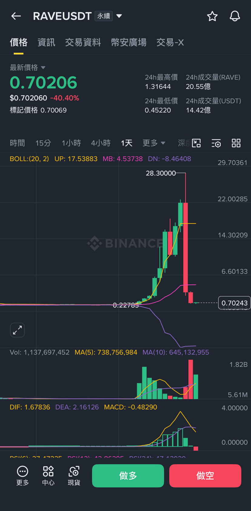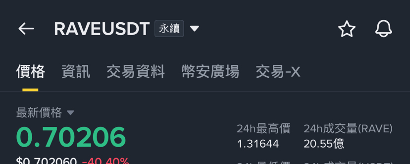 *流動性枯竭:** 雖然 24 小時成交量看起來很大(20.55 億 RAVE),但在這種斷崖式下跌中,買盤極其脆弱,很容易出現「想賣賣不掉」或嚴重滑價的情況。