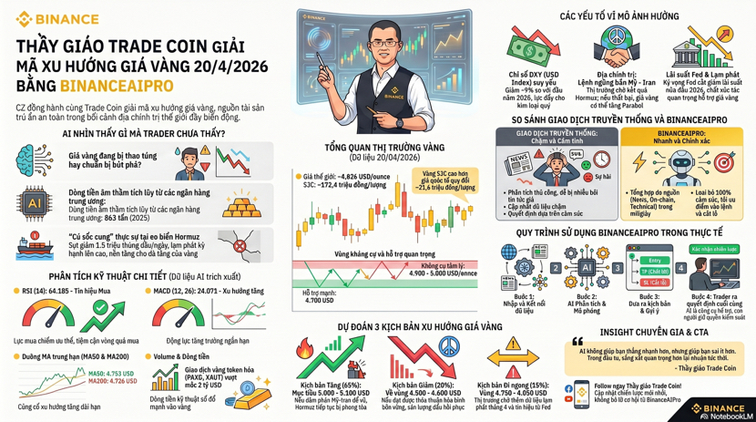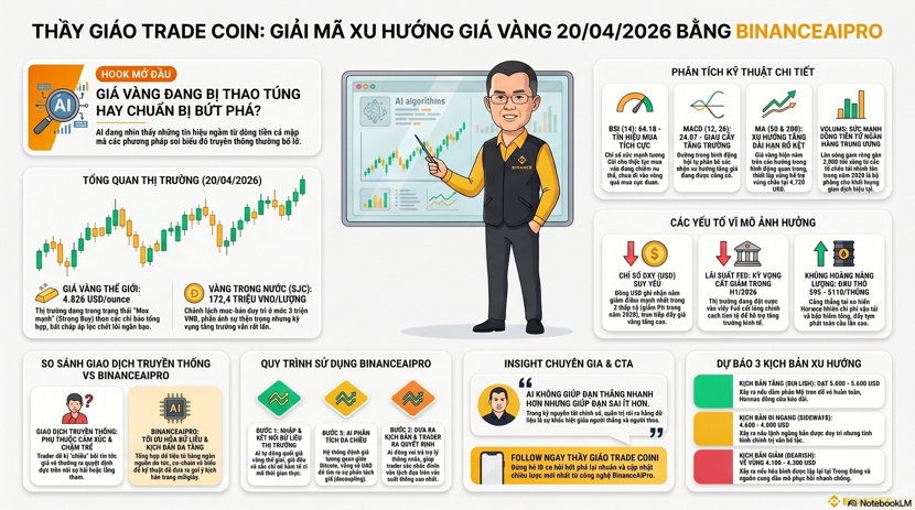 Xin chào anh em, mình là thầy giáo trade coin, hôm nay 20 tháng 4 năm 2026 mình ngồi nhìn biểu đồ vàng mà có cảm giác thị trường đang chơi trò ú tim với trader, lúc thì tưởng sẽ lao như tên lửa, lúc lại phanh gấp như xe buýt giờ cao điểm. Biểu đồ vàng hôm nay cho thấy một nhịp điều chỉnh khá đáng chú ý, khi Reuters ghi nhận spot gold giảm 0.8 phần trăm xuống 4790.59 đô một ounce và hợp đồng vàng kỳ hạn tháng 6 lùi về 4811 đô, trong bối cảnh đồng USD mạnh hơn, lo ngại lạm phát quay lại và căng thẳng địa chính trị tại Trung Đông tiếp tục khuấy động tâm lý thị trường, còn Barrons cũng ghi nhận giá vàng futures đầu phiên châu Âu quanh 4815 đô khi dầu tăng mạnh sau biến động ở Eo biển Hormuz. ([Reuters][1]) Với góc nhìn của một người sống bằng chart, mình thấy vàng hôm nay không hẳn là yếu đi theo kiểu mất trend, mà là đang bị kéo co giữa hai lực rất rõ, một bên là tâm lý trú ẩn truyền thống, một bên là áp lực từ USD và lợi suất, nên ai trade vàng mà chỉ nhìn mỗi cây nến thì dễ bị nến vả cho tỉnh. Đây chính là chỗ mà trade truyền thống và BinanceAIPro khác nhau rất rõ. Nếu trade truyền thống, mình phải tự mở chart, tự đọc tin, tự đo độ mạnh của xu hướng, tự lọc cả đống tiếng ồn từ mạng xã hội, rồi còn phải tự chiến đấu với cái tôi của mình, mà cái tôi trong trading nó nguy hiểm lắm, vì nó luôn nói câu quen thuộc là tôi thấy chuẩn rồi, trong khi thị trường đang cười nhẹ ở góc phòng. Còn với BinanceAIPro, mình dùng nó như một lớp lọc thông minh, không phải để nó ra lệnh thay mình, mà để nó rút ngắn thời gian tổng hợp dữ liệu, gợi ý kịch bản và nhắc mình nhìn ra những điểm mà cảm xúc thường bỏ sót. Theo tài liệu chính thức của Binance, Binance Ai Pro là một AI agent beta được xây dựng trên hệ sinh thái OpenClaw, có thể hỗ trợ phân tích thị trường, thực thi giao dịch và giám sát tài sản, đồng thời tạo tài khoản AI riêng và liên kết API key với cơ chế tách biệt quyền để tăng tính an toàn vận hành. ([Binance][2]) Nói vui một chút thì trade truyền thống giống như anh em tự nấu lẩu một mình, từ thái rau đến canh nước, còn BinanceAIPro giống như có thêm một trợ lý biết đi chợ, biết sơ chế, biết nhắc nêm gia vị, nhưng cuối cùng nồi lẩu có ngon hay không vẫn phụ thuộc tay nghề của đầu bếp. Kinh nghiệm của mình khi dùng AI vào trading thực tế là không bao giờ hỏi nó theo kiểu mua hay bán ngay, vì như thế rất dễ biến AI thành cái loa phóng thanh cho định kiến của mình, mà mình sẽ hỏi theo ba lớp, thứ nhất xu hướng hiện tại đang nghiêng về đâu, thứ hai vùng nào đang là điểm tựa hoặc điểm gãy, thứ ba kịch bản nào sẽ khiến mình sai và phải thoát. Cách này giúp mình giữ được tư duy xác suất thay vì tư duy phán quyết, và đó là thứ cứu tài khoản nhiều hơn bất kỳ bí kíp màu mè nào. Với vàng, mình thích dùng AI để quét nhanh bối cảnh vĩ mô, ví dụ hôm nay USD mạnh hay yếu, lợi suất đang lên hay xuống, giá dầu có đang kích thích kỳ vọng lạm phát không, rồi mới quay lại chart để xác nhận bằng cấu trúc giá. Cái hay của BinanceAIPro là nó giúp mình tiết kiệm năng lượng tinh thần ở khâu lặp lại, để mình dành não cho phần khó hơn là ra quyết định và quản trị rủi ro.