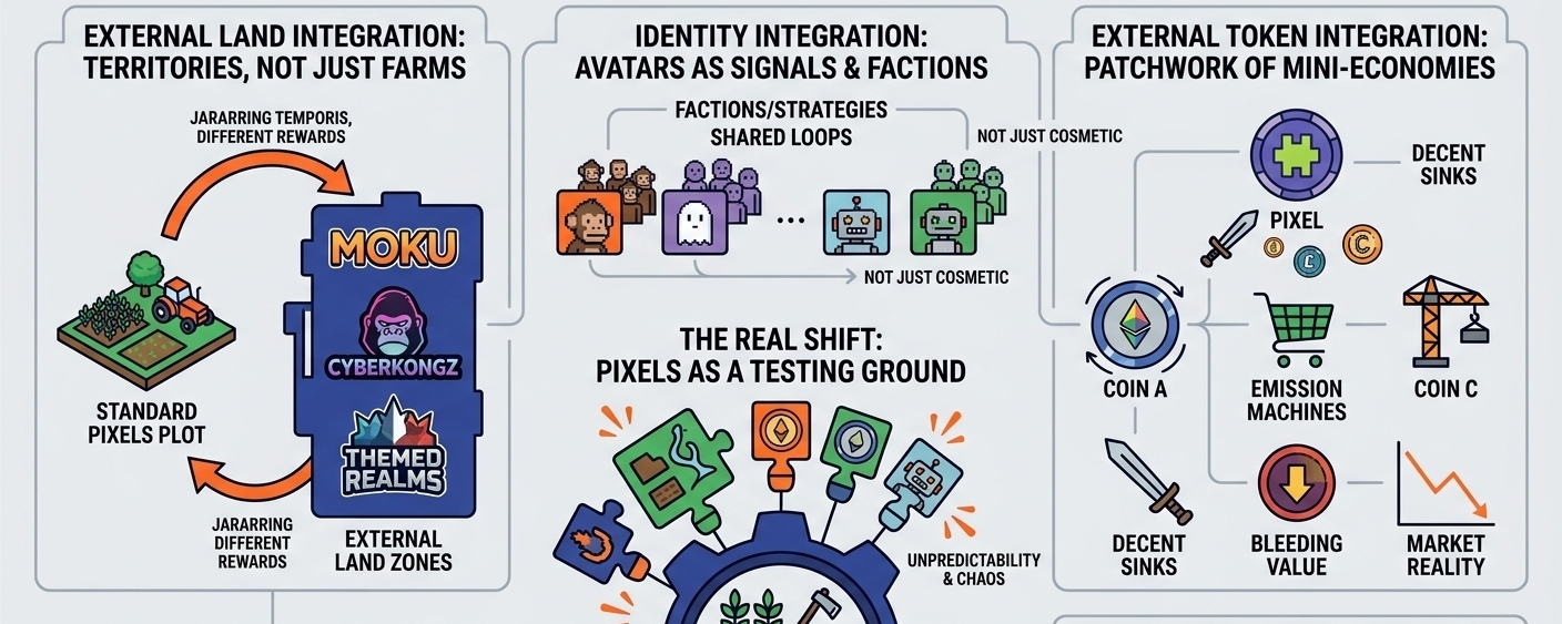 Because suddenly your neat little farm isn’t “the game.” It’s just one zone in a mess of overlapping systems. I’ve walked from a standard Pixels plot into a themed land tied to something like Moku or CyberKongz, and it’s immediately obvious, you’re not playing the same loop anymore.