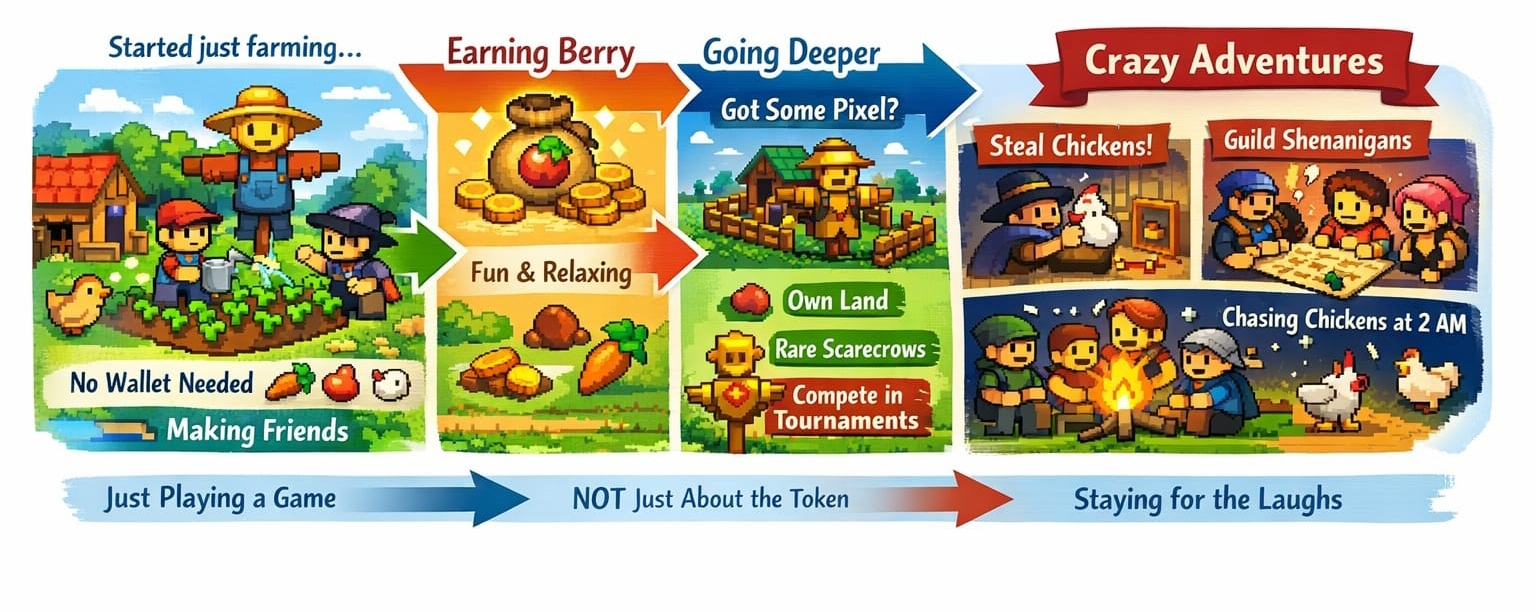 I spent my first two hours just farming. Watering. Harvesting. Running around a pixel art world that looks like it was drawn by someone who loved old Game Boy games. I met other players, not avatars with weird wallet addresses, but people with silly hats and usernames like PotatoQueen99. We traded carrots. We waved. Someone's pet chicken ran away and three strangers helped chase it.