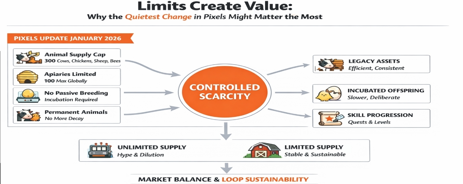 Back in late January 2026, January 22 to be exactthe Pixels team pushed what looked like a routine update through their official channels. But the details told a different story. Legacy animals cows, chickens, sheep, bees and others were locked with a hard supply cap of 300 each globally. Apiaries were capped even tighter at 100. Some systems like sluggeries stayed craftable, and coops tied into NFT land traits. At the same time, animals became permanent. No more running away. No more passive decay.