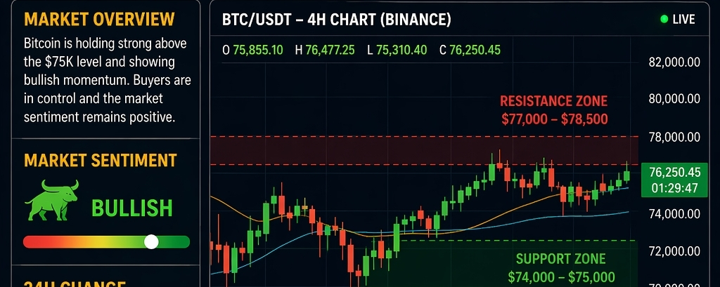 Bitcoin is holding above the $75K level, which is acting as a strong support zone. Buyers are stepping in on dips, and the market structure suggests continuation toward higher resistance levels.