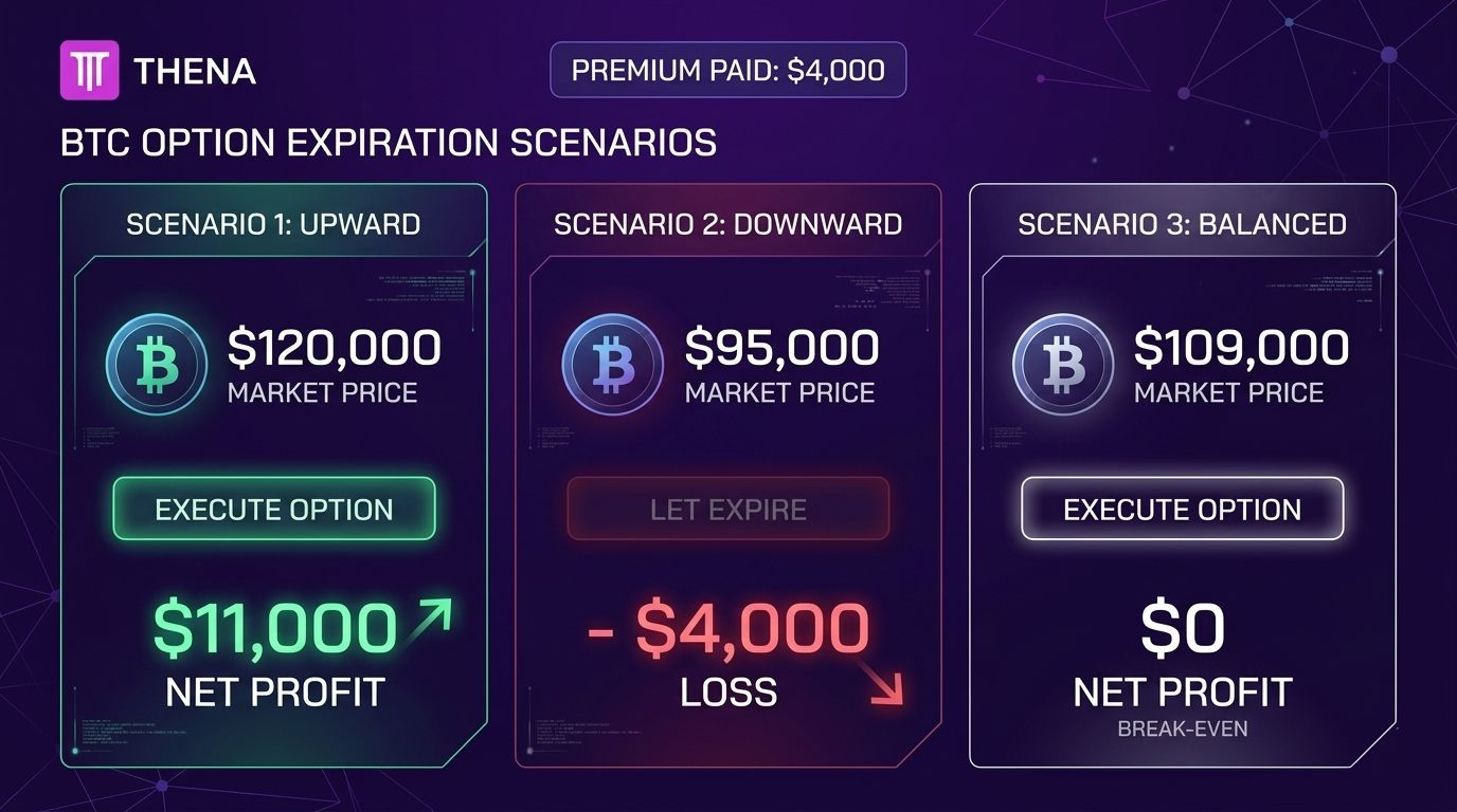 First: $BTC price jumps to $120K. You buy at $105K, gain a $15K price difference, subtract the $4,000 premium, and net $11K in profit.