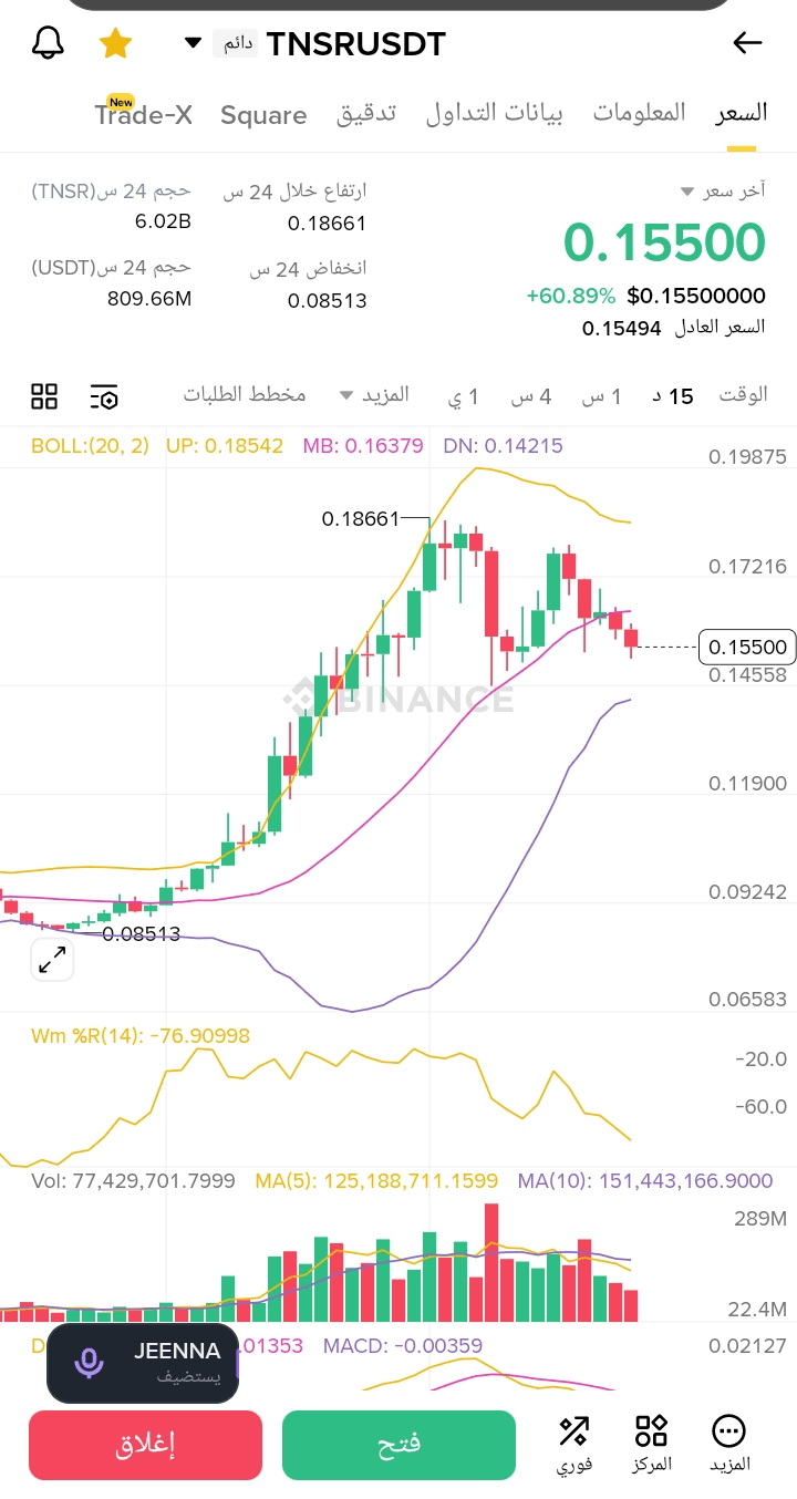 Пара TNSR-USDT испытала сильное восходящее движение от 0.0850 до 0.1866, поддержанное высоким объемом торгов, затем вошла в фазу коррекции. Текущая цена 0.1556 представляет собой небольшое снижение от пика с относительной стабилизацией.