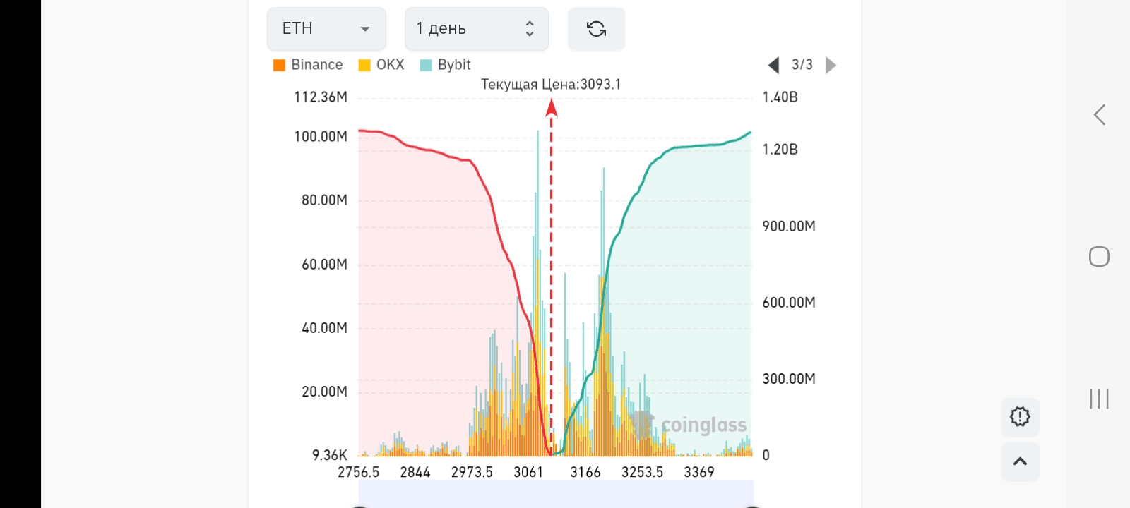 Лонги (красные): крупный диапазон ликвидаций около $3071 — если цена пойдёт вниз, именно здесь начнут выбивать лонгистов.