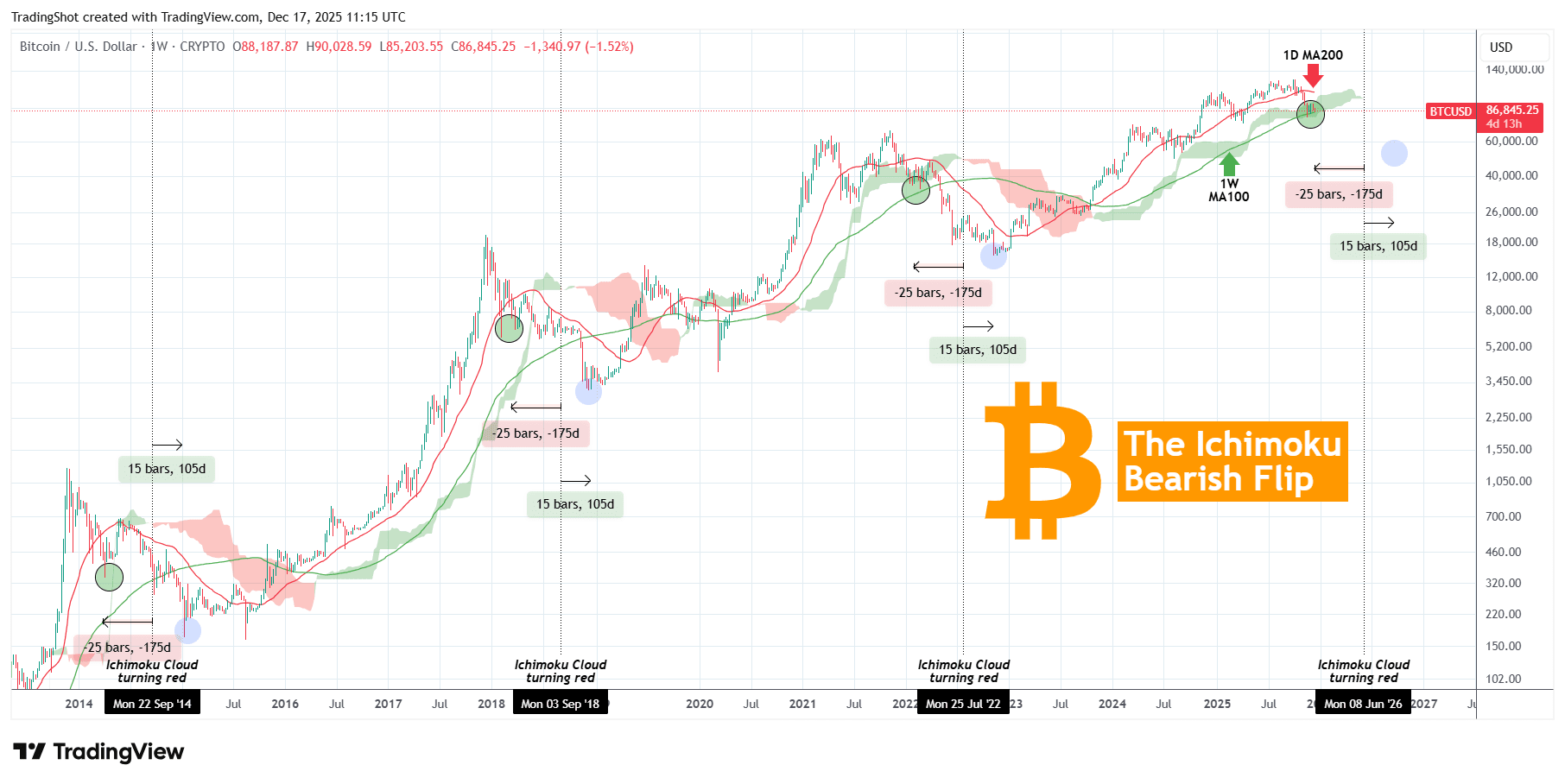 Биткойн (BTCUSD) находится в процессе превращения своего 1W Ишимоку облака из бычьего (зеленого) в медвежье (красное). Он находился в последовательном зеленом состоянии с 23 октября 2023 года.